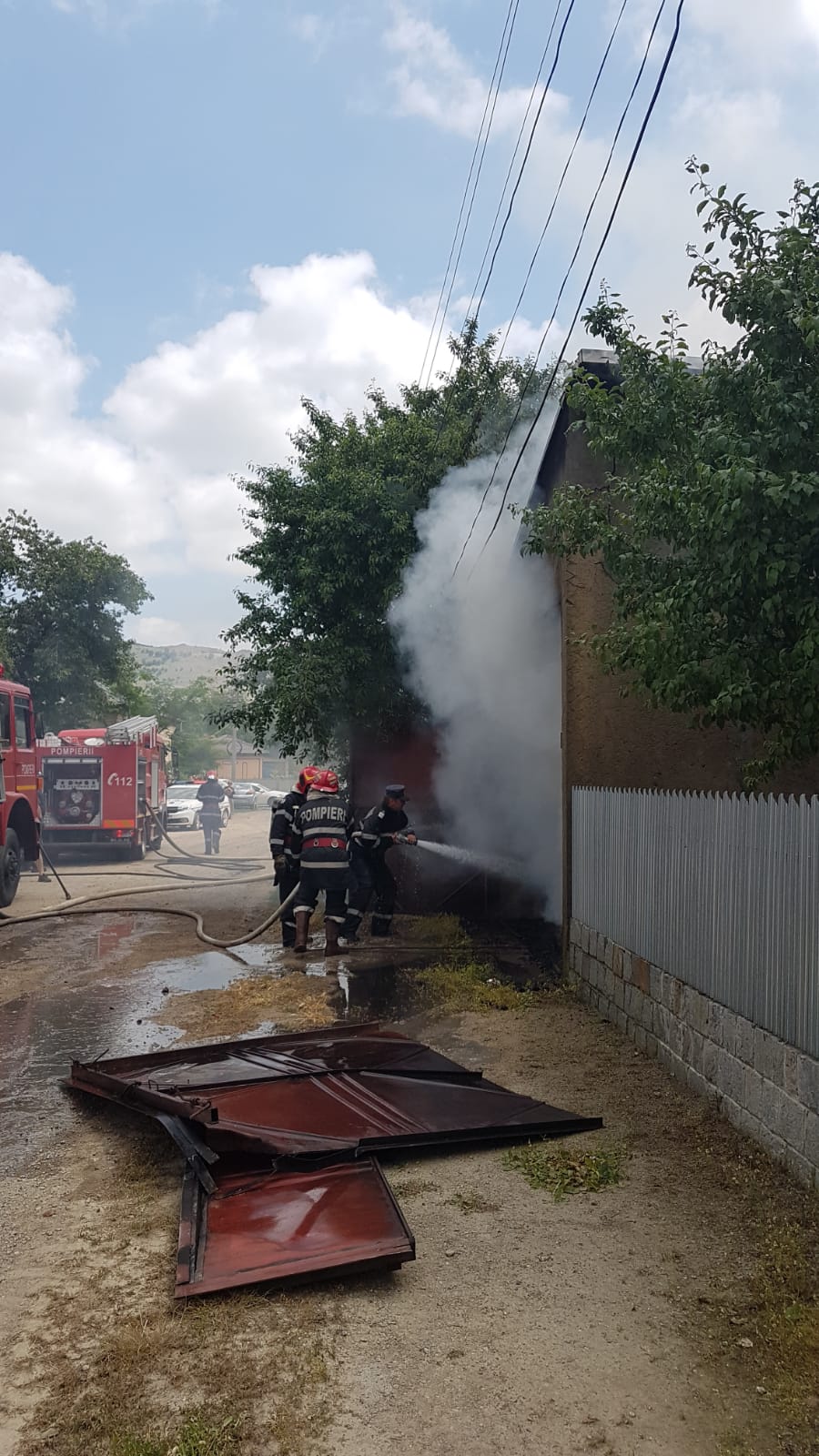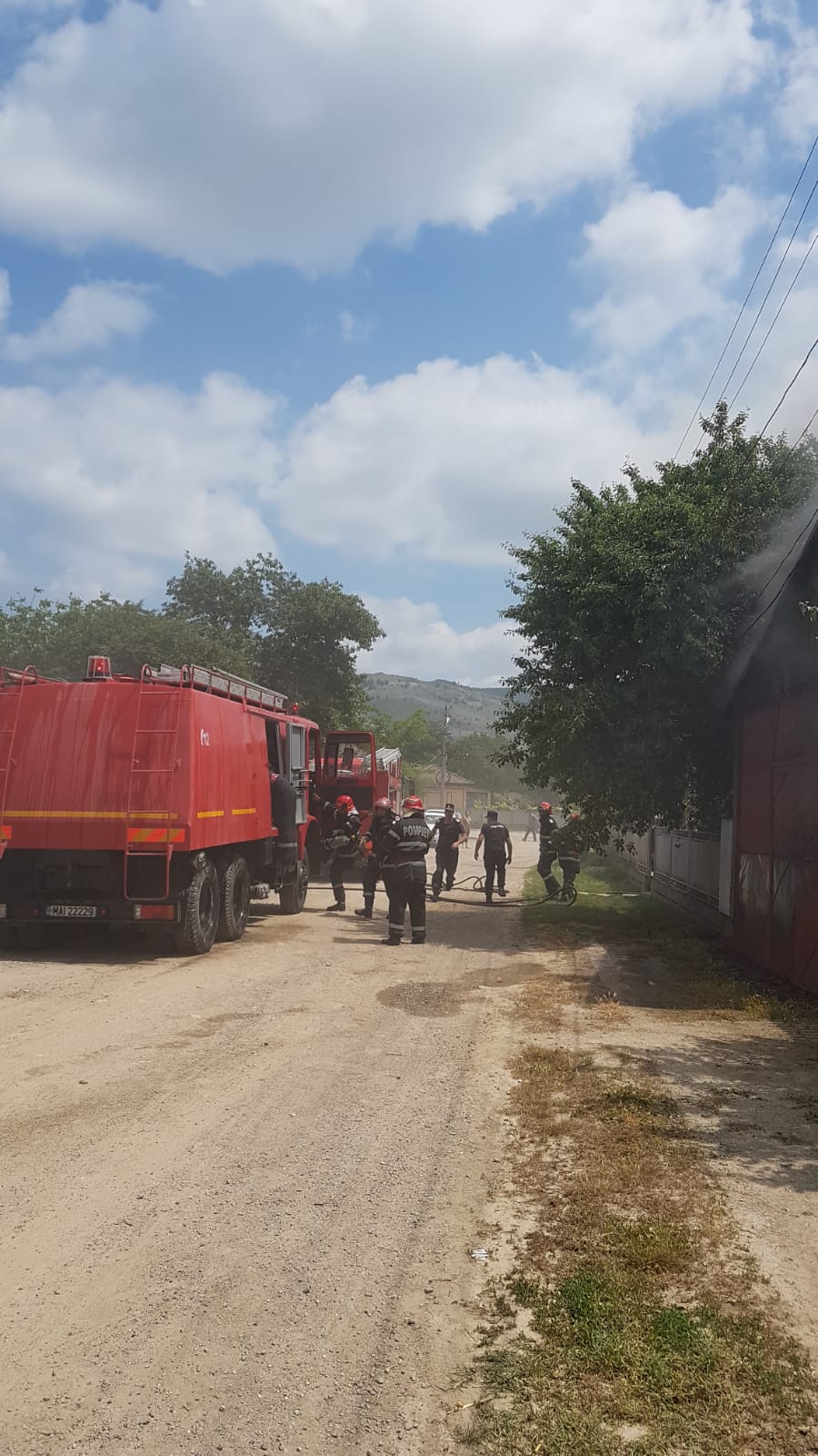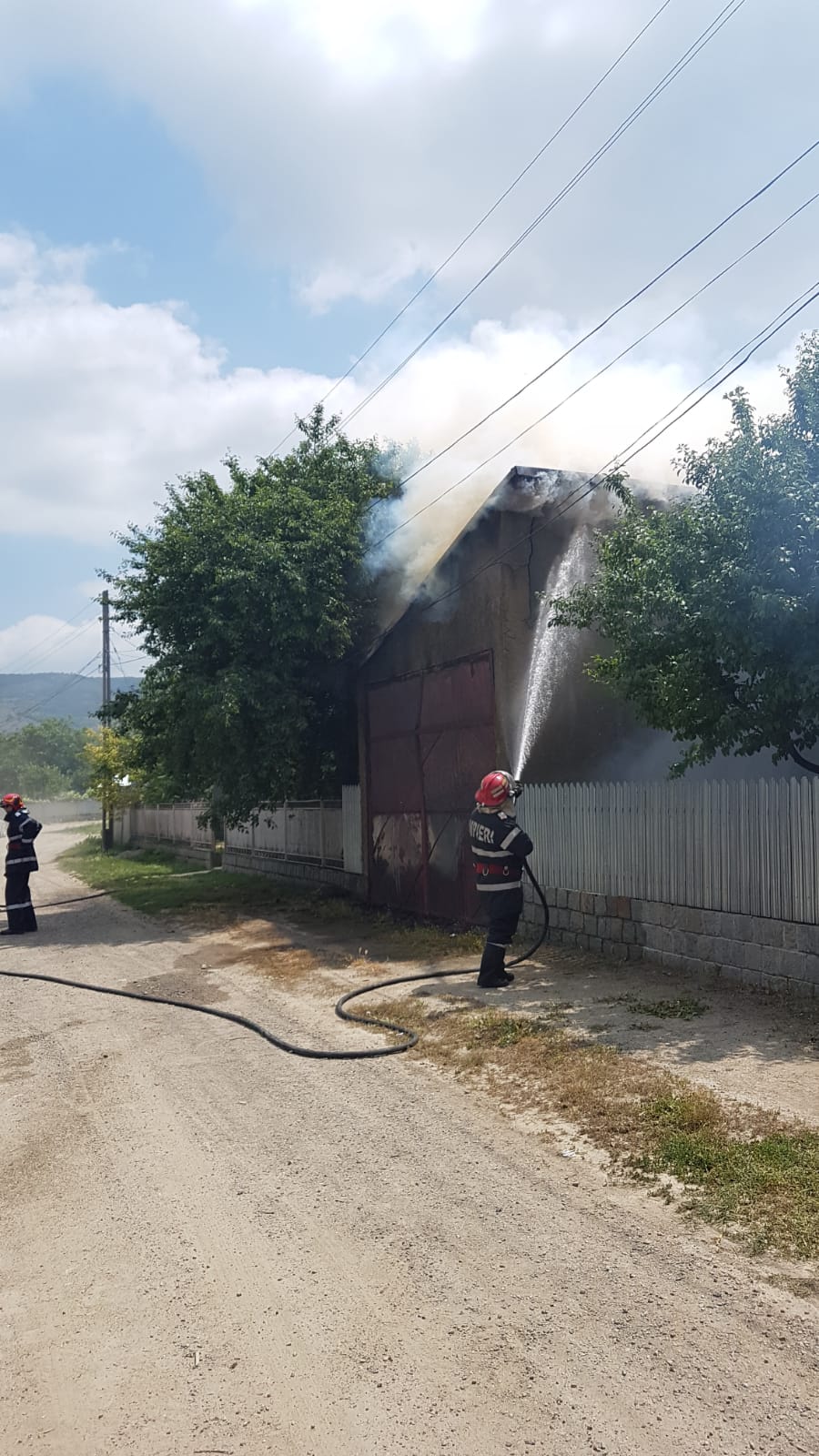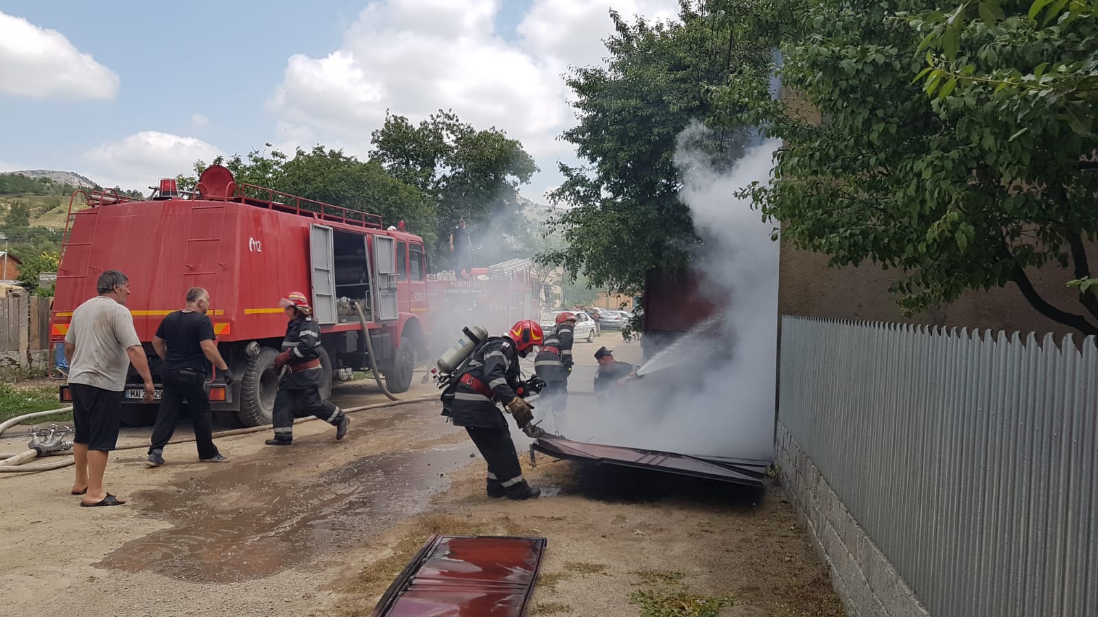 La momentul sosirii pompierilor, incendiul se manifesta violent, cu flacără deschisă la nivelul garajului și a acoperișului casei.