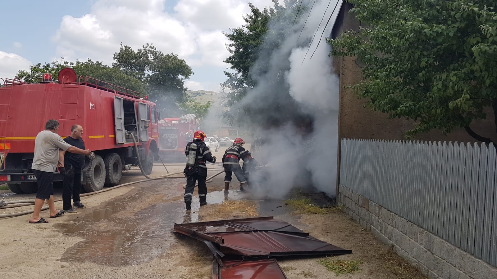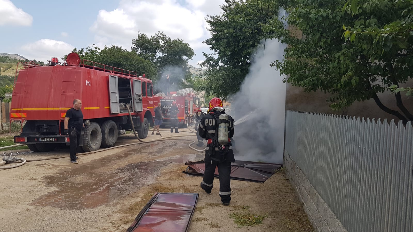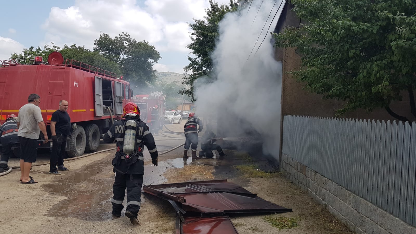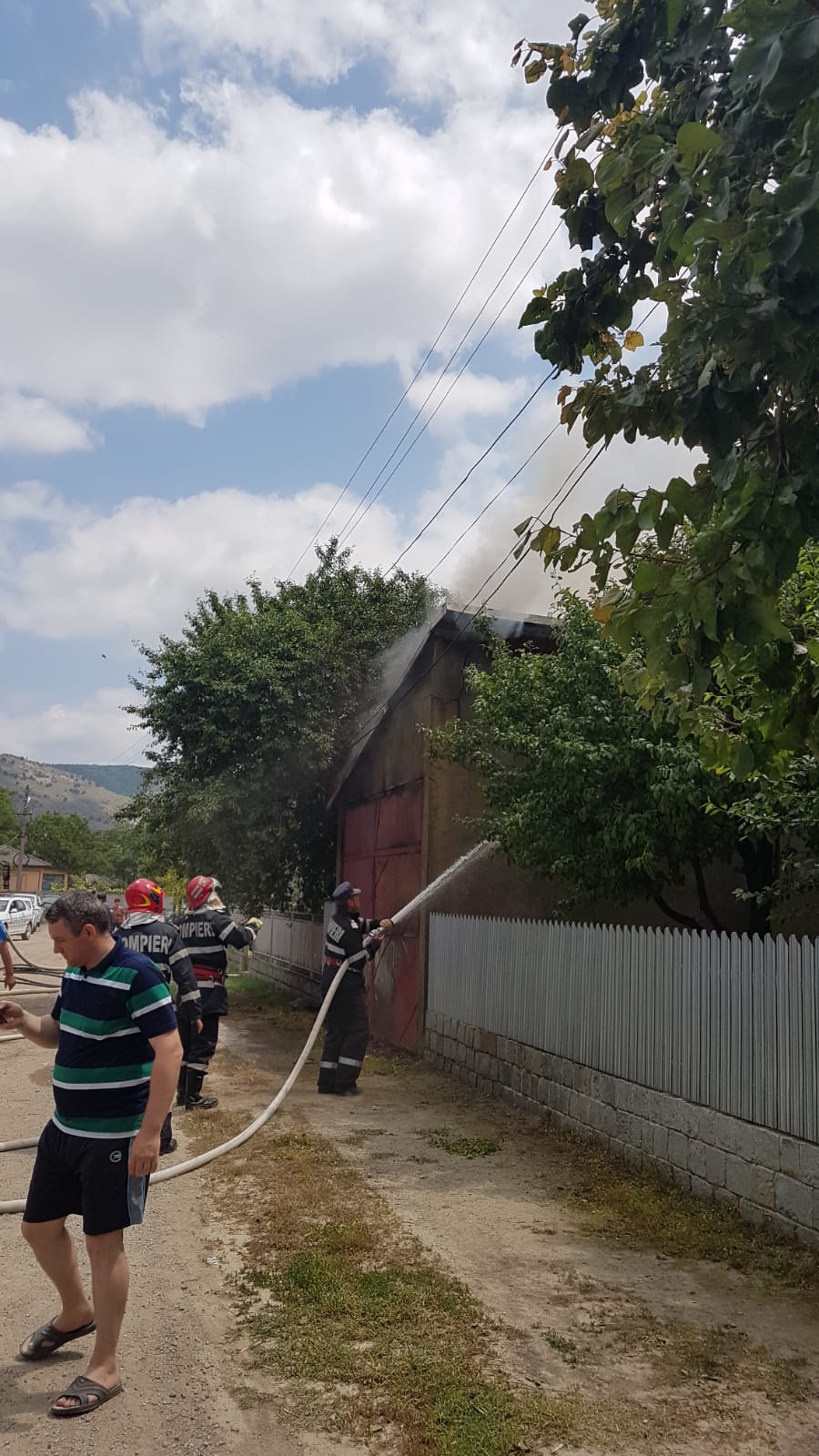 La momentul sosirii pompierilor, incendiul se manifesta violent, cu flacără deschisă la nivelul garajului și a acoperișului casei.