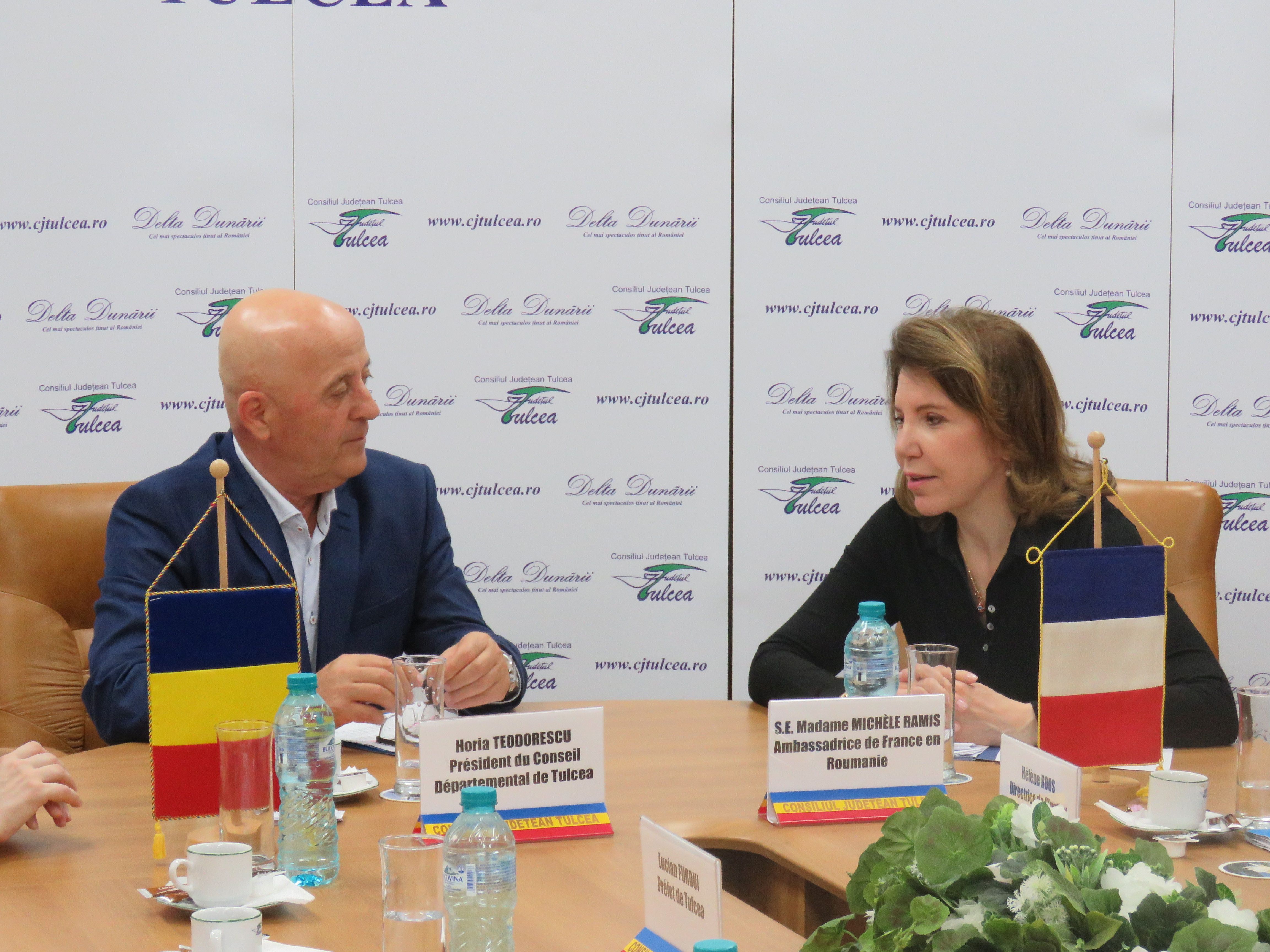 Președintele Consiliului Județean Tulcea, Horia Teodorescu a primit astăzi, vizita Excelenței Sale Ambasadorul Franței la București, doamna Michèle Ramis, care s-a aflat la Tulcea în cadrul unui eveniment înscris pe lista proiectelor finanțate de Sezonul România-Franța 2019, respectiv colocviul internațional „Géo-Histoire des zones humides d’ici et d’ailleurs. Regards croisés sur des trajectoires d’artificialisation et de conservationˮ.