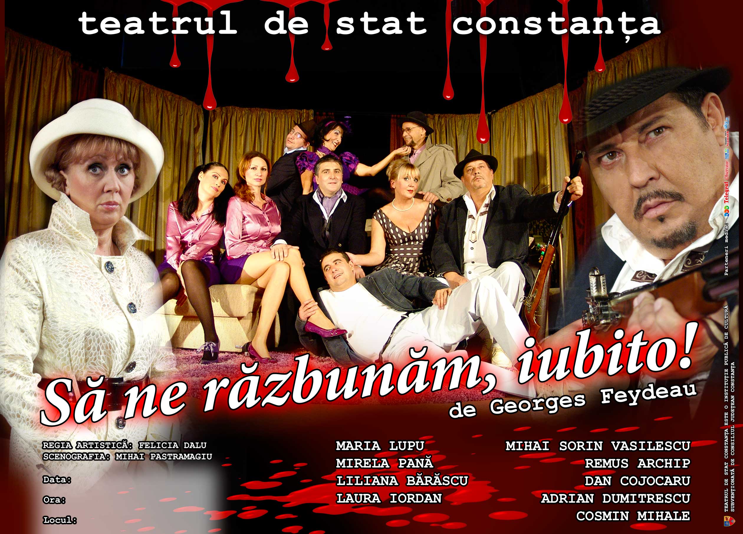 Spectacolul “Să ne răzbunăm, iubito!” ce are ca punct de plecare vodevilul celebrului dramaturg francez Georges Feydeau, este o comedie cu multe răsturnări de situaţie, în care adulterul, pasiunea, minciunile, legăturile dintre personaje, surprizele, replicile de un umor spumos captivează spectatorii şi, mai ales, îi distrează copios.