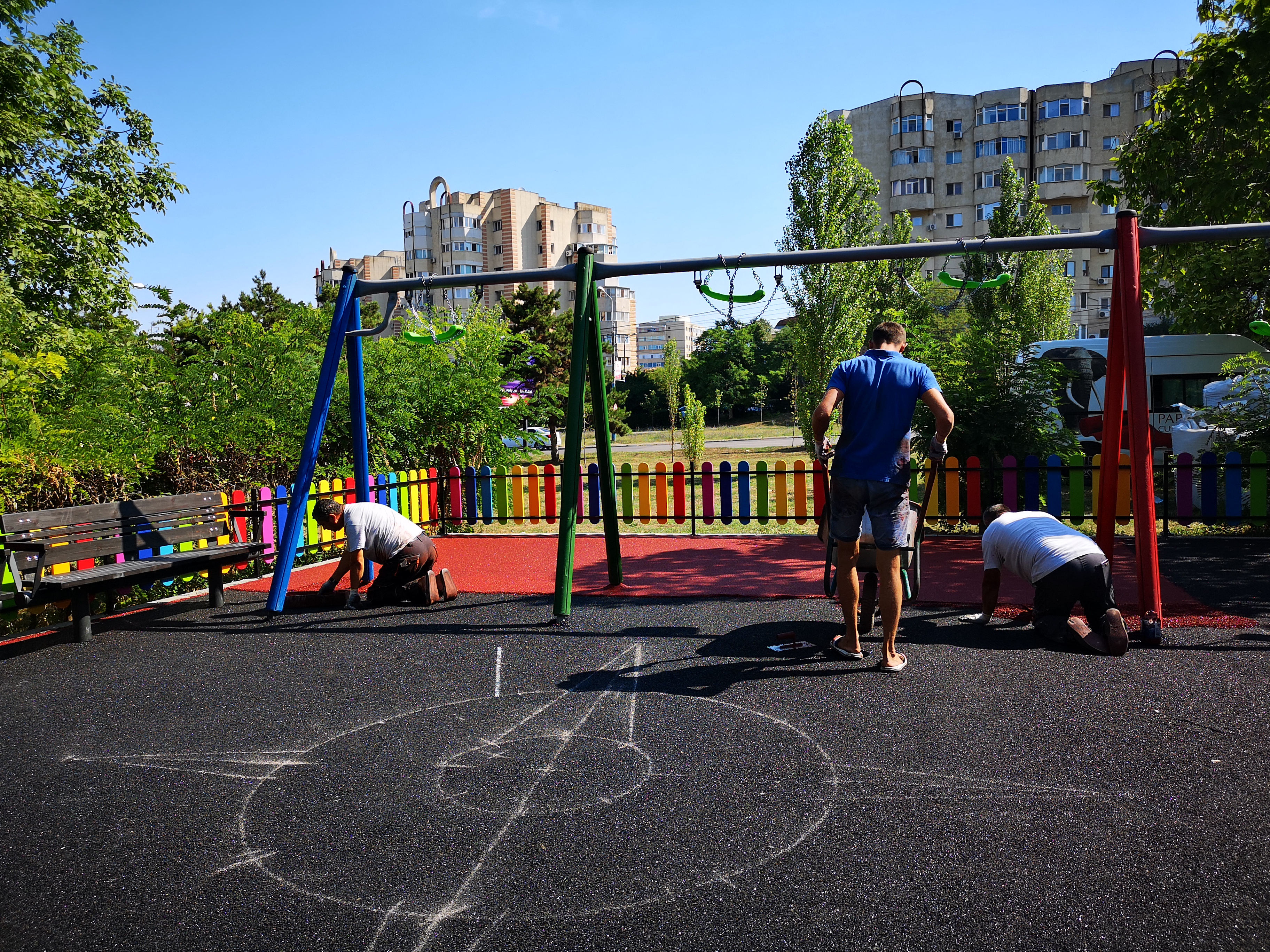 Zilele trecute a fost turnat primul strat al covorului antitraumă, iar acum se lucrează pentru ca și al doilea să fie finalizat cât mai curând. Imediat ce se vor finaliza lucrările în cele două spații de joacă urmează ca echipele să se mute pe strada Baba Novac și de pe aleea Viitorului.