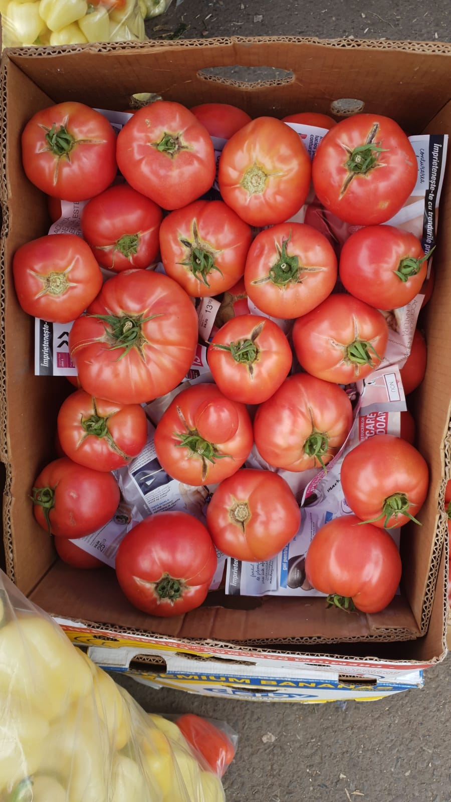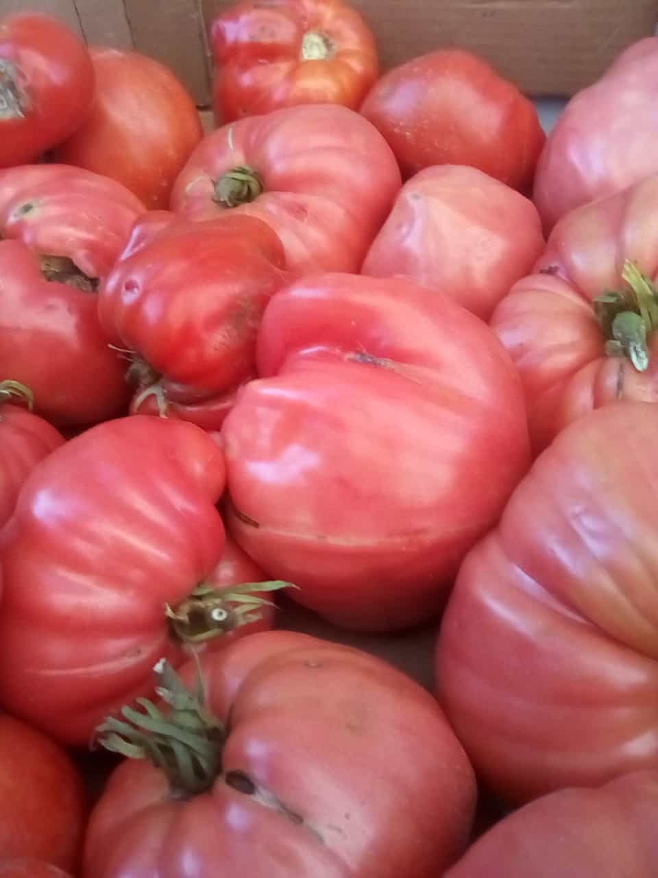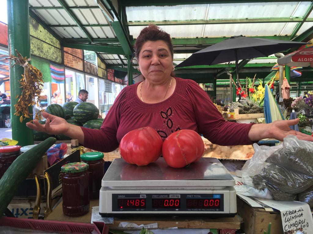 În această perioadă, de pe taraba ei nu lipsesc roșiile ”inimă de bou” gigant, de culoare roz sau roșie, dar și cele crețe sau turtite.