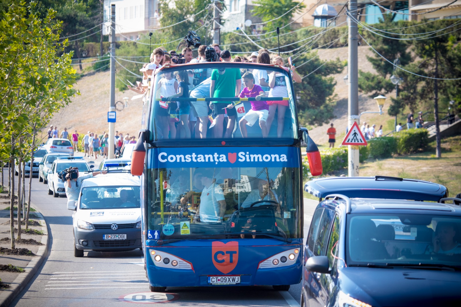 Conferința a fost realizată în mișcare, pe platforma autobuzului supraetajat care a dus-o pe Halep de la Sala Sporturilor în Piața Ovidiu, la întâlnirea cu miile de turiști și constănțeni. Relaxată și cu zâmbetul pe buze, Simona Halep a povestit cât timp petrece pe Instagram, ce ar relata într-un vlog dacă nu ar juca tenis, cum arată vacanța ideală pentru ea sau unde și-ar face nunta atunci când acest moment va veni.