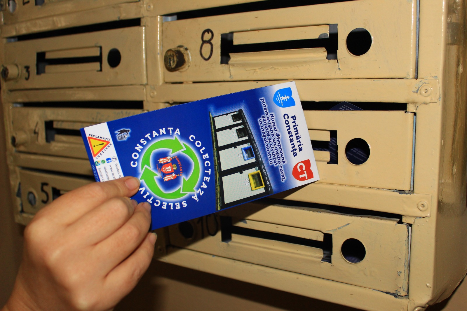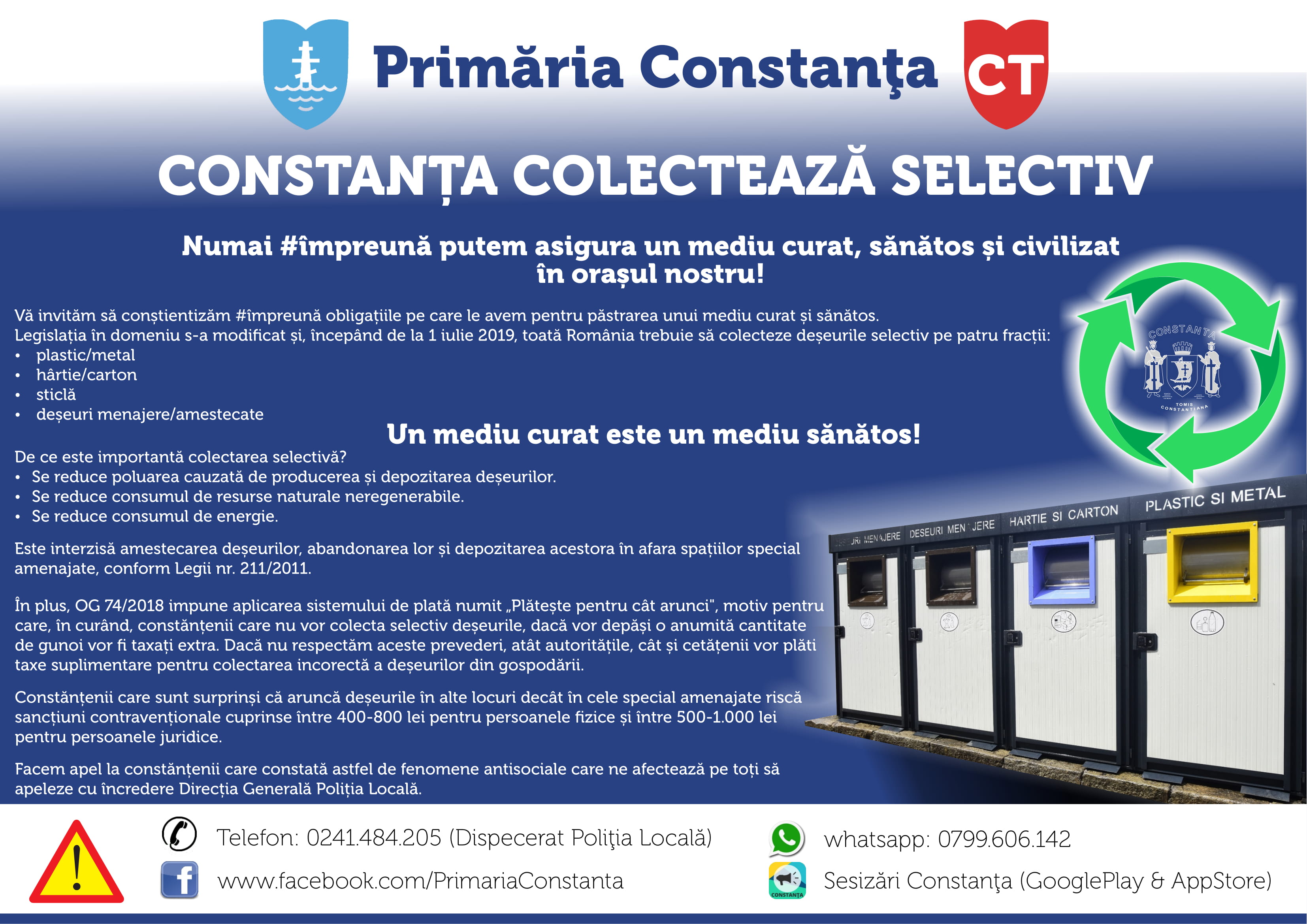Primăria Municipiului Constanța a început astăzi, campania „Constanța colectează selectiv“ prin care constănțenii trebuie să conștientizeze obligațiile pe care le avem cu toții pentru păstrarea unui mediu curat și sănătos. Angajații Serviciului Igienă Publică au împărțit pliante locuitorilor din cartierul Faleză Nord, au lipit afișe la scările de bloc și i-au informat pe localnici despre modificările legislative și despre obligațiile pe care le au cu privire la colectarea selectivă a deșeurilor și depozitarea lor în platformele special amenajate.