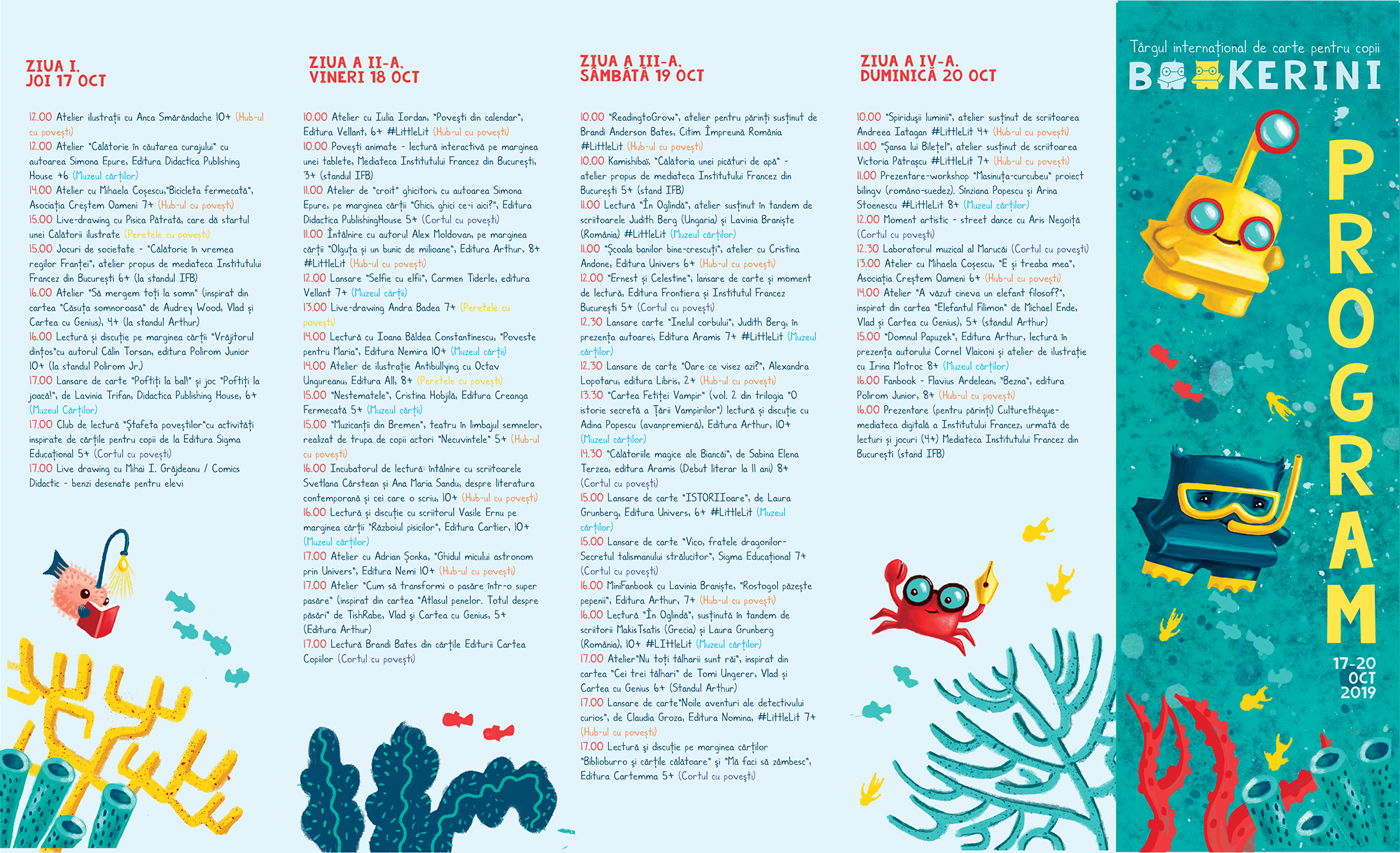 În perioada 17-20 octombrie, la Biblioteca Națională a României va avea loc a doua ediție a târgului internațional de carte pentru copii BOOKerini. Timp de patru zile, între orele 10.00 – 18.00, copiii sunt așteptați să-și întâlnească autorii preferați, să stea de vorbă și să-i asculte citind, să deseneze la Peretele cu povești alături de ilustratorii îndrăgiți, să citească și să asculte povești în locurile special amenajate pentru ei, să participe la cele peste 50 de evenimente pregătite de organizatori pentru copii.