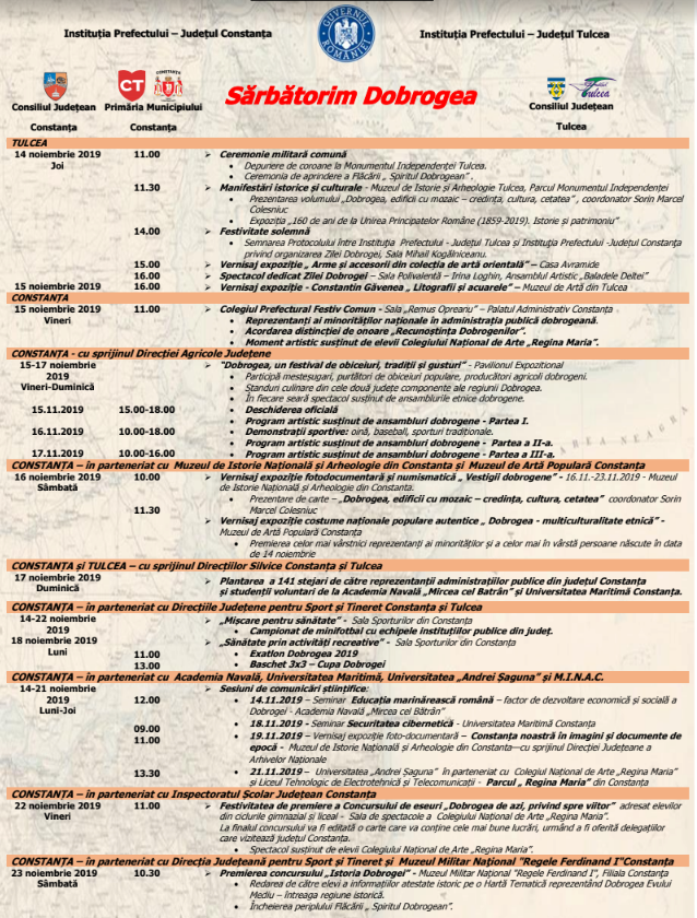 De asemenea, Primăria Constanţa a informat că evenimentele prilejuite de această sărbătoare se vor desfăşura pe durata a zece zile, începând cu 14 noiembrie şi vor include festivitatea solemnă de semnare a protocolului între Instituţia Prefectului – Judeţul Tulcea şi Instituţia Prefectului – Judeţul Constanţa privind organizarea Zilei Dobrogei, o ceremonie militară comună de depunere de coroane la Monumentul Independenţei Tulcea şi de aprindere a Flăcării „Spiritul Dobrogean”, prezentări de carte, expoziţii, momente artistice, un târg de produse tradiţionale, un festival de obiceiuri şi tradiţii, evenimente sportive, comunicări ştiinţifice etc, manifestările urmând a se încheia la 23 noiembrie 2019.