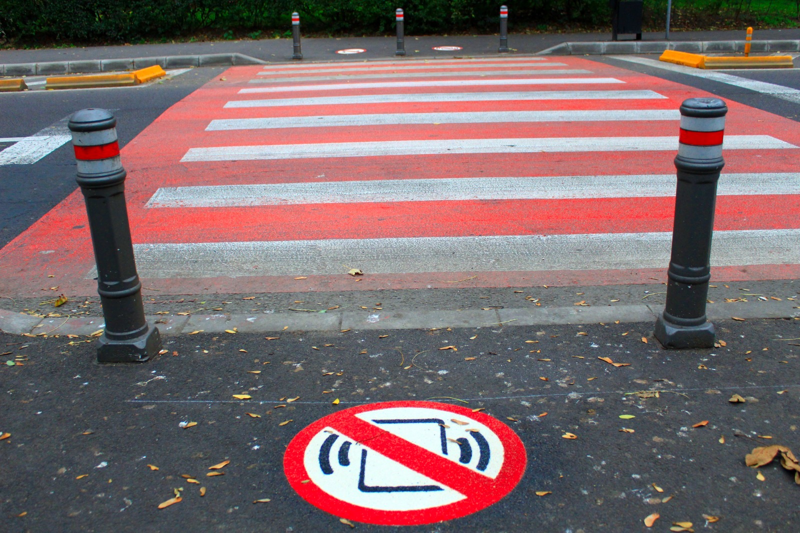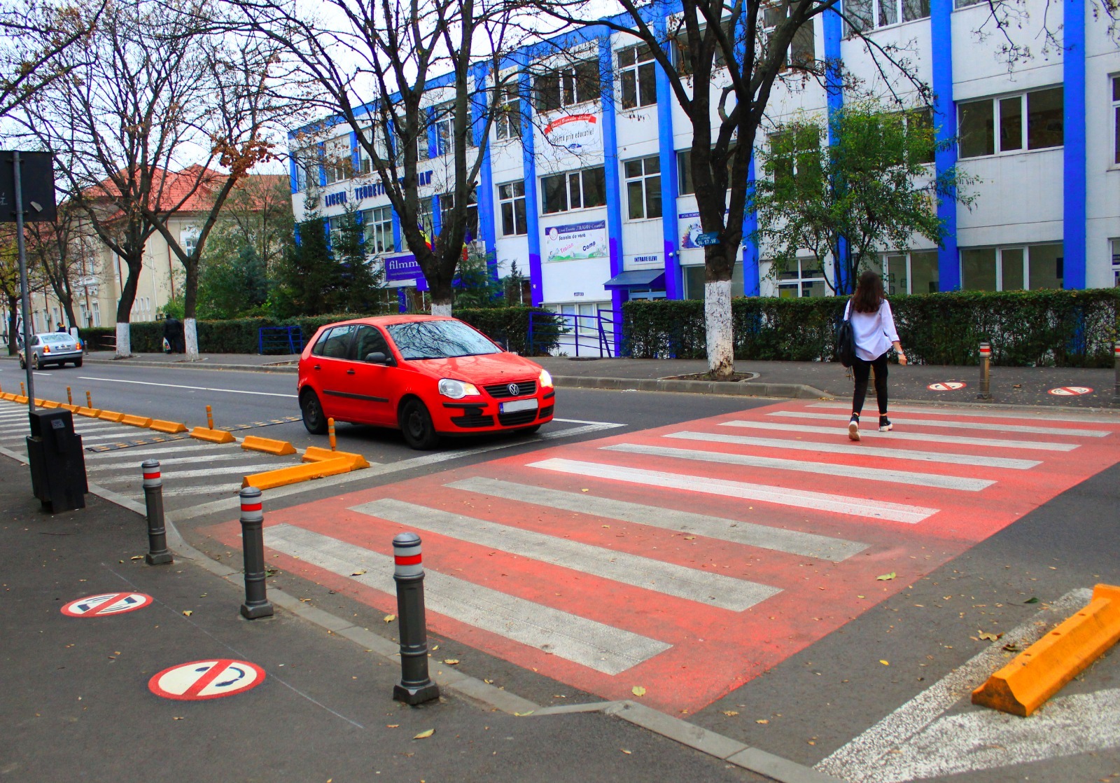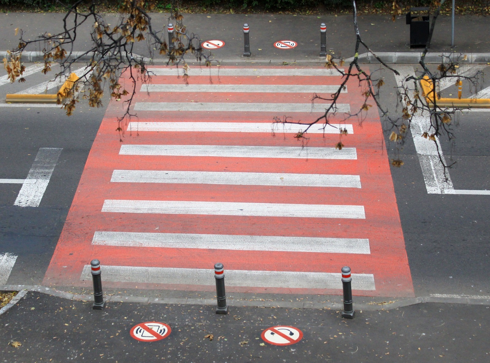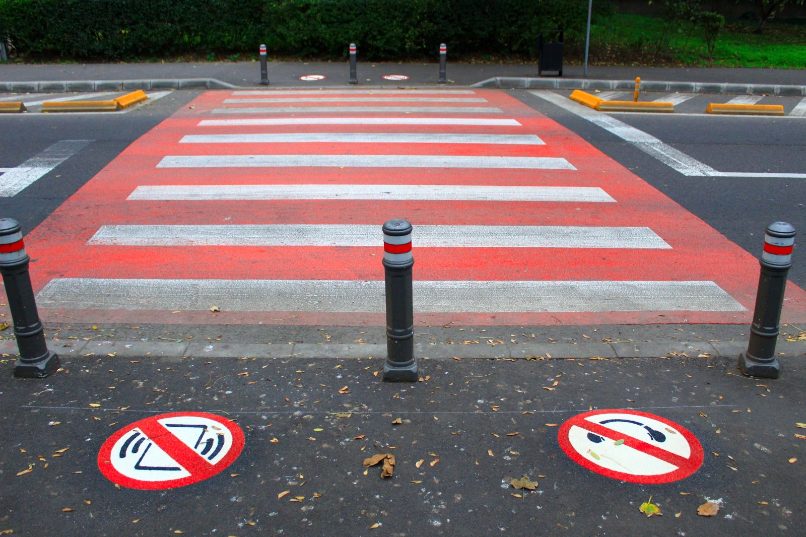La trecerea de pietoni de pe strada Traian, în zona Liceului Teoretic „Traian” au fost desenate marcaje pe trotuar, prin care participanții la trafic sunt avertizați că nu au voie să treacă strada dacă au telefonul sau căștile în urechi.