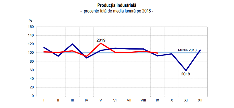- În industrie, producţia crește în primele nouă luni din 2019 cu 0,7% faţă de aceeași perioadă din 2018. P