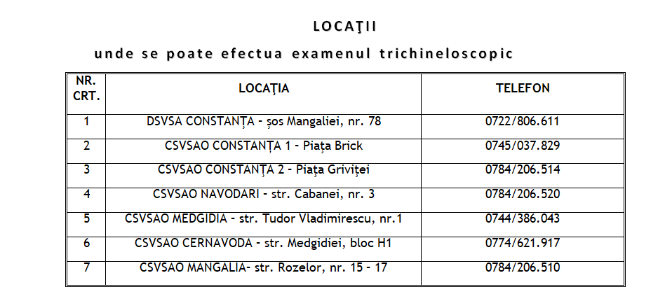 Direcţia Sanitară Veterinară şi pentru Siguranţa Alimentelor Constanţa asigură examinarea trichineloscopică în punctele special amenajate aflate în sediul D.S.V.S.A. Constanţa, Piaţa Brick, Piaţa Griviţei şi în cadrul Circumscripţiilor Sanitare Veterinare şi pentru Siguranţa Alimentelor din oraşele Mangalia, Cernavodă, Medgidia şi Năvodari.