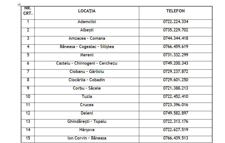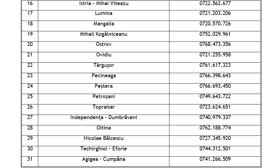 Se asigură serviciul de permanenţă în perioada 30.11.2019 – 07.01.2019, iar neconformităţile sau abaterile de la legislaţia sanitară veterinară sesizate pot fi comunicate la numărul de telefon 0786/577.007, precum şi la număr de telefon “Call Center” ANSVSA 0800.826.787.