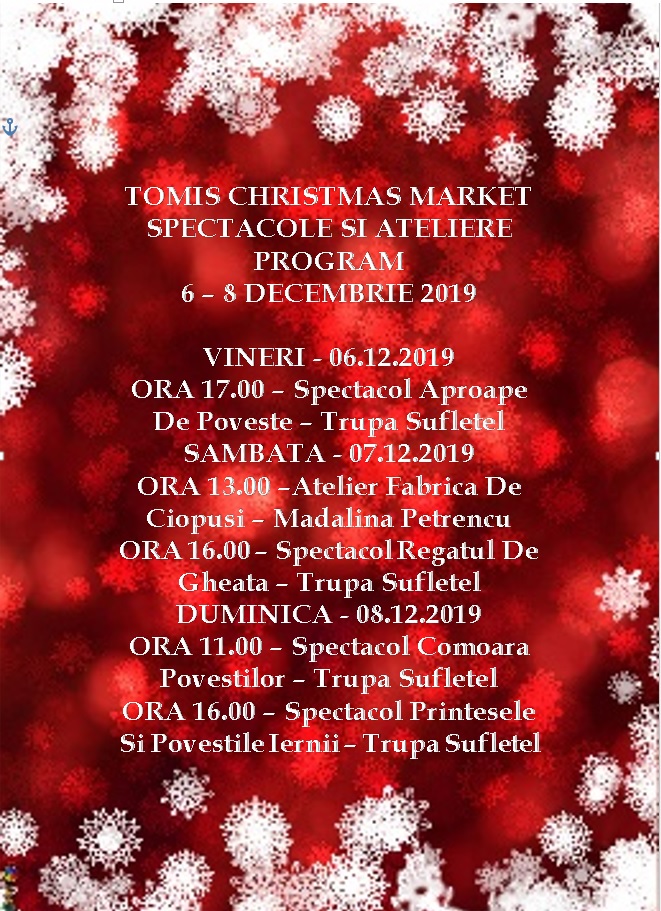 Tomis Christmas Market va deveni locul de întâlnire al tuturor constănţenilor, mari şi mici, cu dorinţe, bucurii şi chef de joacă şi de distracţie. Iarna şi poveştile copilăriei vor fi spuse şi trăite de actori, alături de copii, părinţi şi bunici, într-un adevărat regat hibernal, cu spectacole, colinde, coruri, costume spectaculoase, surprize, ateliere magice şi multe altele.