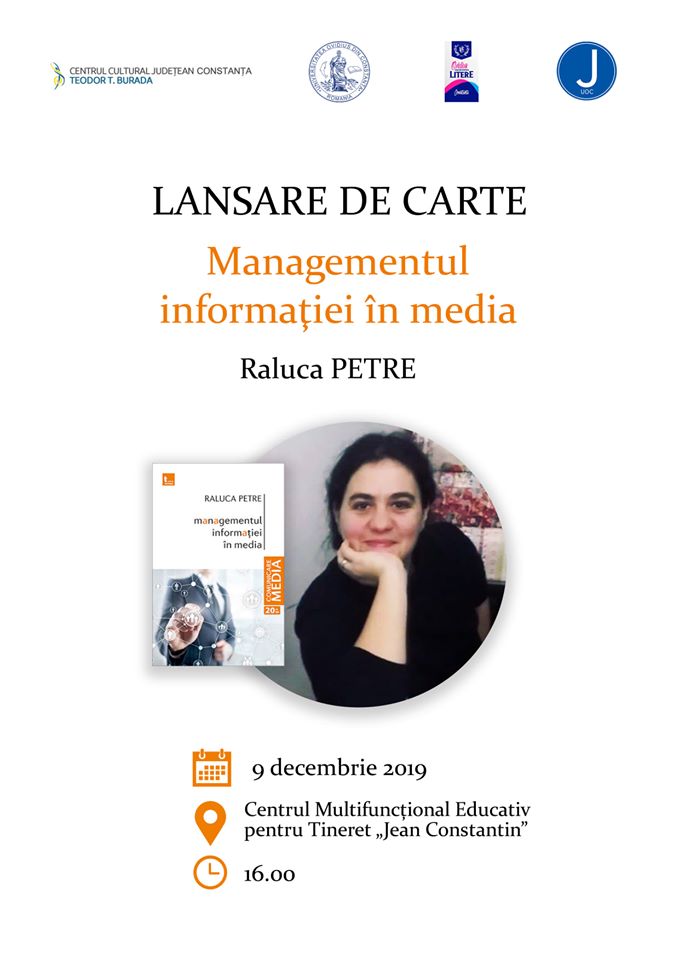 Conf. univ. dr. Raluca Petre, coordonatorul Specializării Jurnalism din cadrul Facultății de Litere a Universității „Ovidius” din Constanța (UOC), și-a lansat cel mai recent volum, „Managementul informației în media”. Cartea Ralucăi Petre își propune să fie un ghid anti-manipulare care să ajute consumatorii de mass-media să facă diferența între adevăr și non-adevăr, între știri documentate și zvonuri, între știri reale și fake-news.