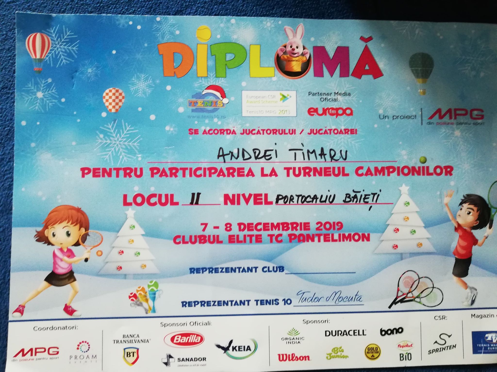 Andrei Timaru : Prima cupă este la Turneul Campionilor la categoria Verde-Challenger – locul I și a doua este la categoria Portocaliu, la finaliști – locul II la băieți. Le-am câștigat în ultimele două weekend-uri. Am început tenisul la 3 ani și jumătate. Mă antrenez cu tatăl meu, de 3 ori pe săptămână: luni, miercuri și vineri la la ora 16.30 la ora 20.
