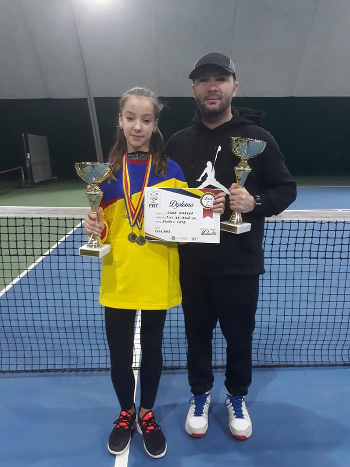 Andreea Soare: Am câștigat două titluri naționale, la simplu și la dublu (am făcut pereche cu Alexia Tatu din Buzău). În proba de simplu a fost mai greu, pentru că am jucat finala împotriva prietenei mele, alături de care am jucat la dublu. Am fost foarte bucuroasă și mândră să urc pe cea mai înaltă treaptă a podiumului, aceste succese au venit după 5 ani de muncă. Până acum am adunat 10 medalii și 57 de cupe. Primul concurs a fost la Slobozia, în anul 2017, aveam 9 ani și am ajuns până în semifinale. Am timp și de școală, încerc să mă descurc foarte bine și la cursuri. Dintre toate materiile, cel mai mult îmi plac sportul și Limba Română. Mă bucur acum de vacanță, merg la antrenamente și mă joc. Idolul meu este Simona Halep, am cunoscut-o și aș vrea să ajung într-o zi să joc cu ea și să câștig. Pentru anul 2020 îmi doresc să câștig campionatele naționale de vară și să câștig selecția națională.