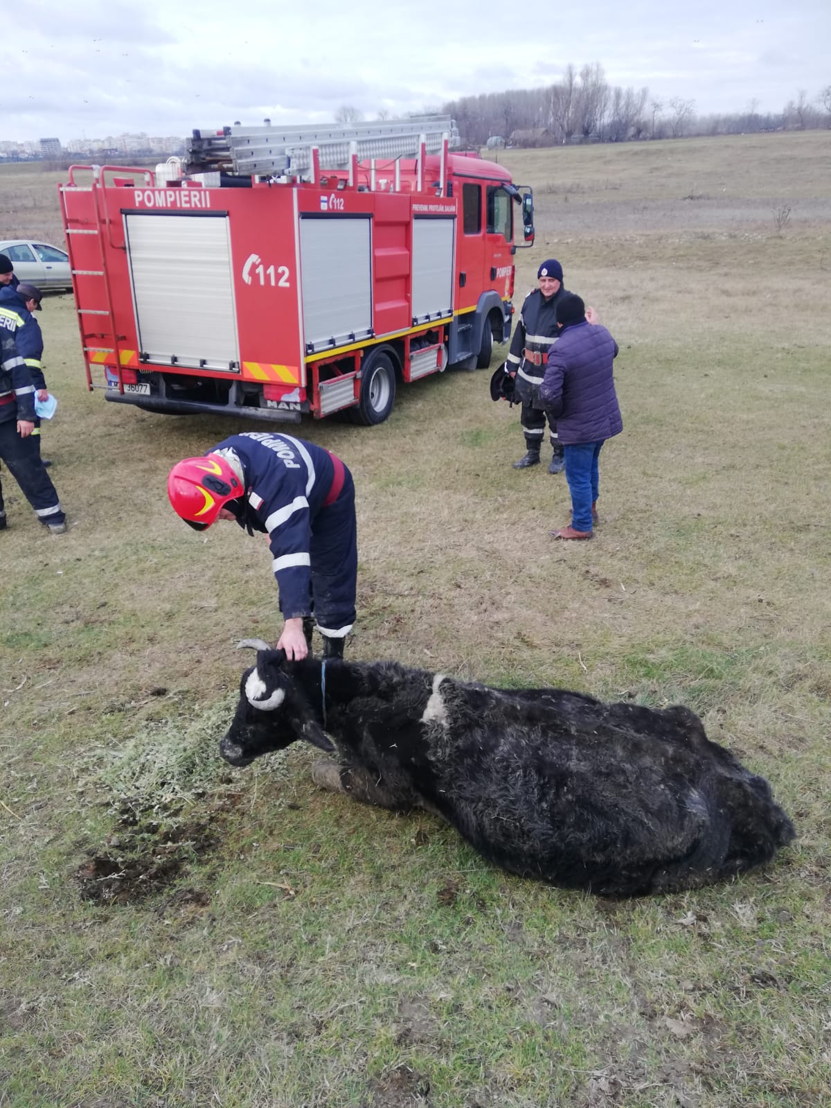 Șase pompieri, cu o autospecială de stingere cu apă și spumă, din cadrul Secției Măcin au intervenit astăzi, în urma unui apel la numărul unic de urgență 112, în localitatea I.C. Brătianu, pentru a salva o bovină împotmolită în noroi.