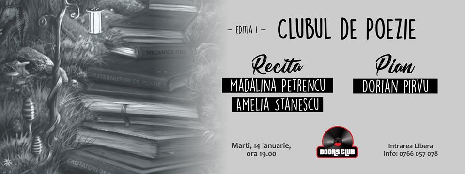 De această dată, marți, 14 ianuarie, cu o zi înainte de sărbătorirea zilei lui Eminescu, la Clubul „Doors“ din Constanța, se deschide Clubul de Poezie, de la ora 19.00. Alături de Amelia Stănescu se vor afla actrița Mădălina Petrencu și pianistul Dorian Pîrvu, un artist special, membru al bandului Mike Godoroja & Blue Spirit.