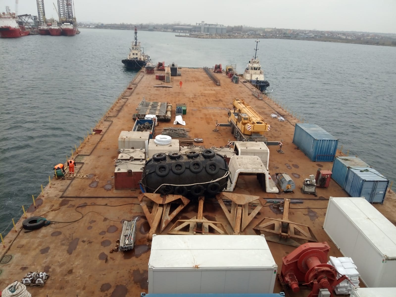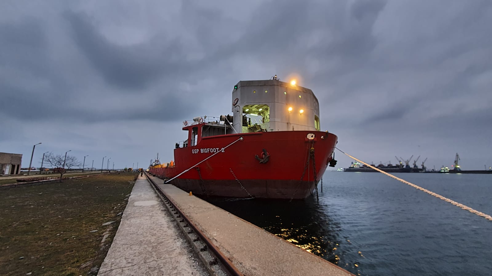 În această dimineață, barja GSP Bigfoot 2 este acostată în dana 2 a portului Midia și așteaptă pilotul la bord pentru a începe manevra de poziționare lângă epavă.