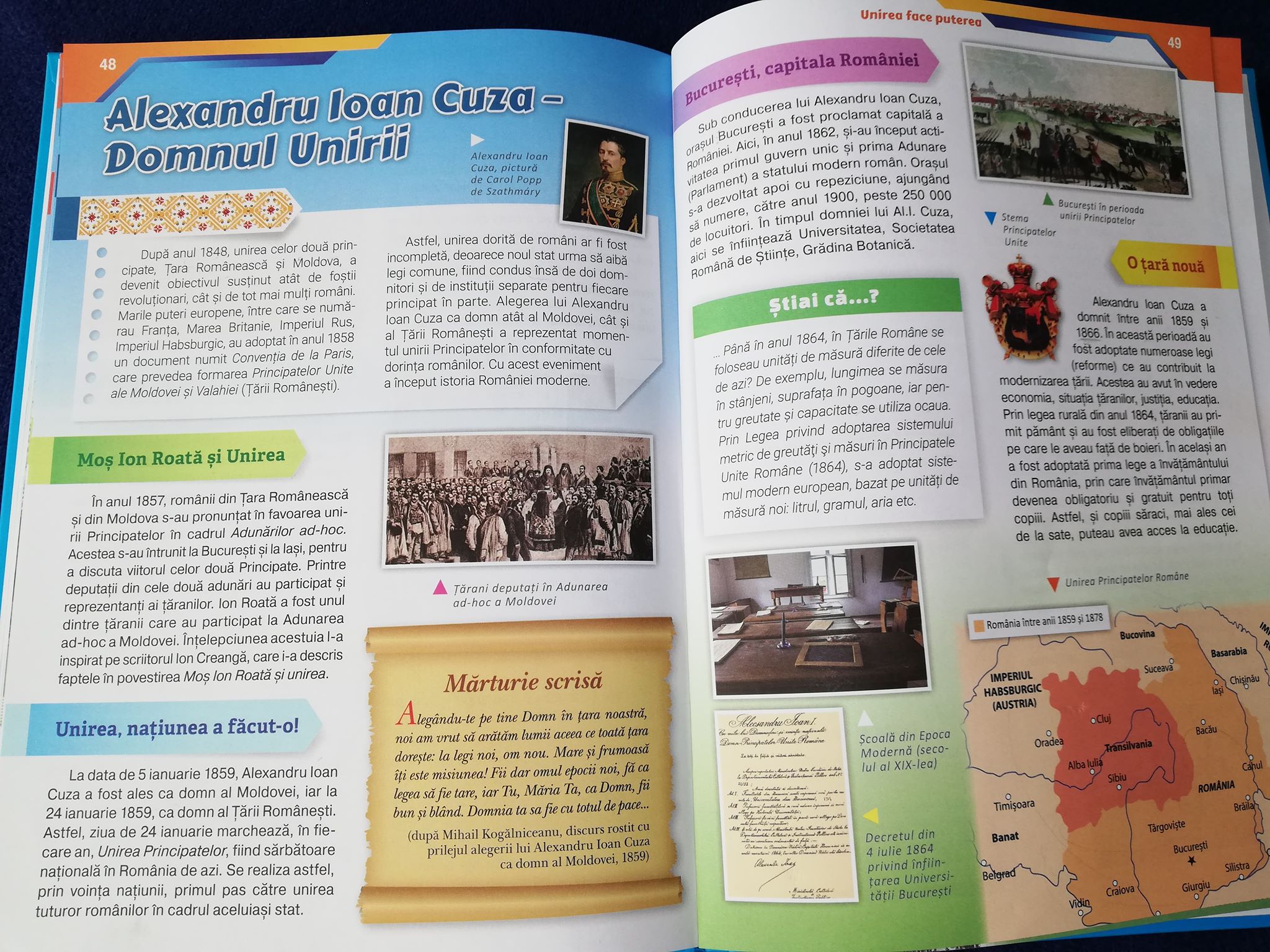 „În data de 24 ianuarie sărbătorim Mica Unire. Înseamnă Unirea dintre Moldova și Țara Românească. Mica Unire s-a produs prin votarea lui Alexandru Ioan Cuza ca domnitor în Moldova și în Țara Românească. Marile Puteri nu-și doreau ca românii să se unească într-un singur stat. Oamenii mari ai Românilor, oamenii înțelepți printre care s-au aflat și Mihail Kogălniceanu și Vasile Alecsandri au profitat că Marile Puteri n-au spus că nu au voie să se aleagă aceeași persoană în Moldova și în Țara Românească. Și adunările ad-hoc au ales aceeași persoană: pe A.I. Cuza. În decembrie 1861, Înalta Poartă recunoaște unirea celor două țări române sub denumirea Principatele Unite ale Moldovei și Valahiei. După ce a ajuns domnitor, Alexandru Ioan Cuza a dat legi, a adus libertate și pământ țăranilor clăcași. Îmbrăcat în țăran, a umblat prin târguri, unde i-a prins și apoi pedepsit pe bogătașii care îi înșelau pe țărani. Adică i-a prins cu ocaua mică. Și de atunci a rămas această zicală în poporul român: a prinde pe cineva cu ocaua mică înseamnă că face lucruri ilegale. În cinstea acestui mare eveniment istoric, poetul Vasile Alecsandri a scris Hora Unirii. Sub conducerea lui Cuza, orașul București a fost proclamat capitala României. În 1866, cele două principate purtau numele de România. Și tot în 1866, A.I.Cuza a fost obligat să abdice. ”