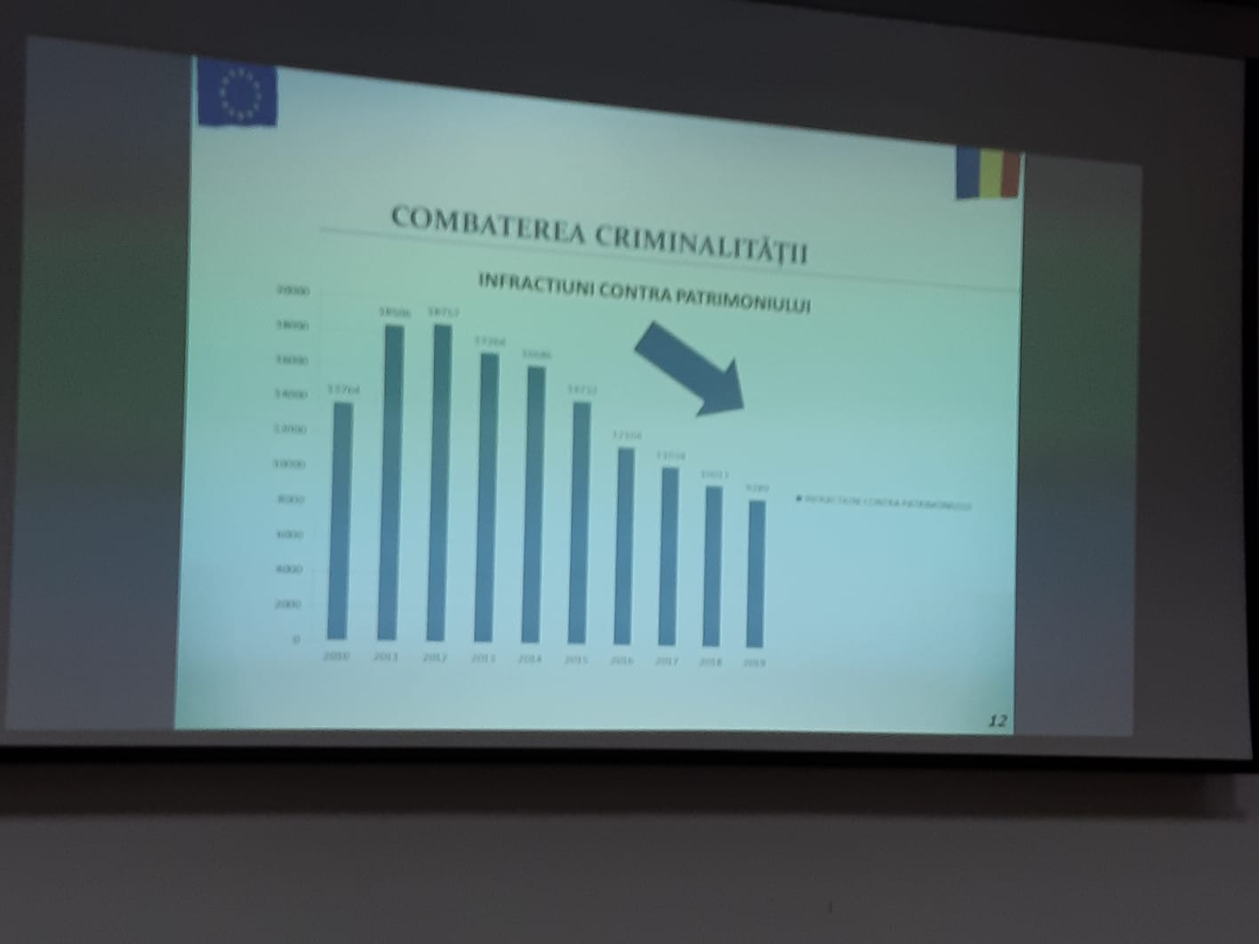 Important de menționat este faptul că numărul infracțiunilor sesizate contra patrimoniului a scăzut cu 889 de fapte, față de anul precedent. În acest sens, infracțiunea de furt a înregistrat o depreciere de 24,6 % (de la 2.959 în 2018 la 2.230 în 2019). Aceeași tendință de scădere o întâlnim și în ceea ce privește infracțiunile de furt din locuință (-169 de fapte), furturi din autovehicule (-33 de fapte), furturile din buzunare (-70 de fapte), furturi de componente din exteriorul autovehiculului (-30 de fapte).