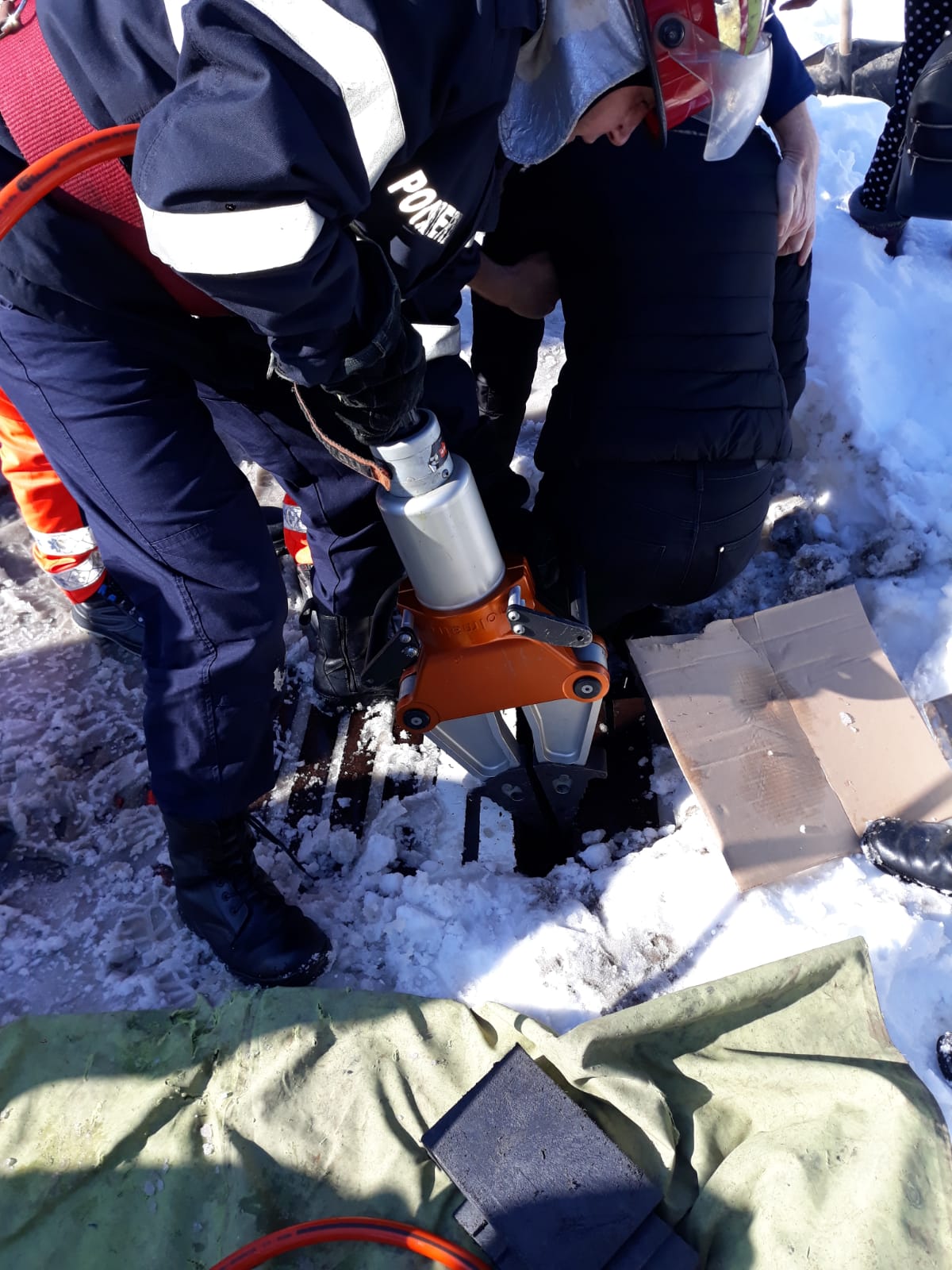 La intervenție au luat parte trei pompieri cu o autospecială de descarcerare grea și în câteva minute i-au deblocat piciorul fetei.