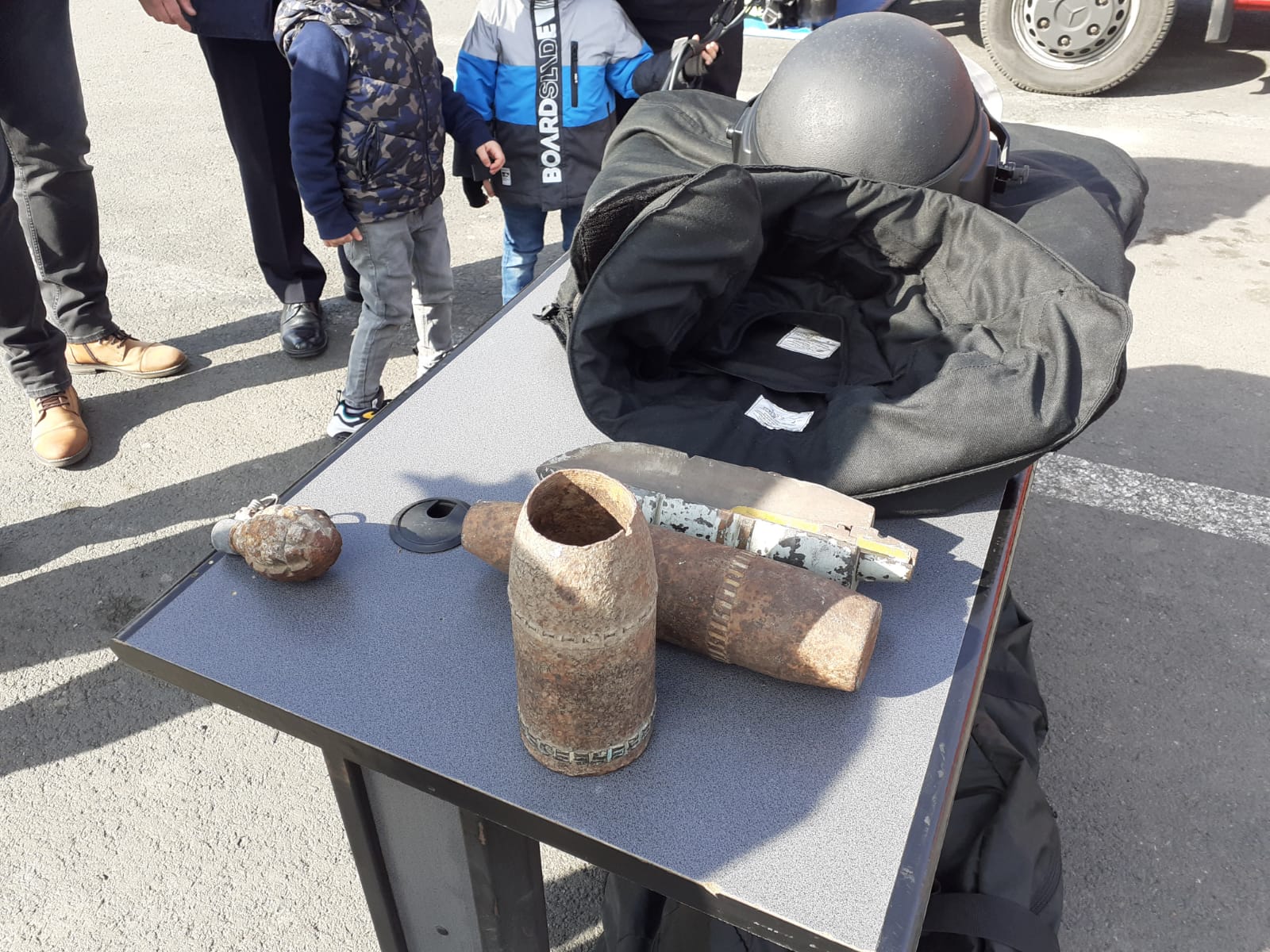 „Aici avem un costum pirotehnic, pentru că noi ne ocupăm cu asanarea terenului de muniție rămasă neexplodată și avem un detector de metale, costumul cu care ne îmbrăcăm când mergem la intervenție și 2 – 3 mostre din ce găsim noi, pe unde lucrăm“, a declarat unul dintre reprezentanții ISU.
