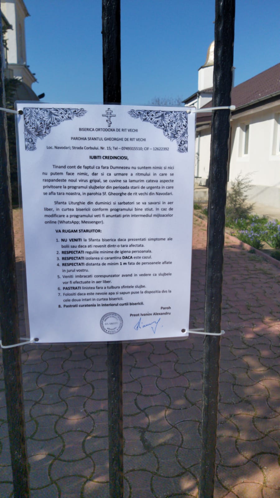 La biserica lipovenească din Năvodari, enoriașii au fost înștiințați de măsurile care se impun, în acest sens, preotul paroh făcând un grup pe What’s Up. Toate slujbele se vor oficia în aer liber.