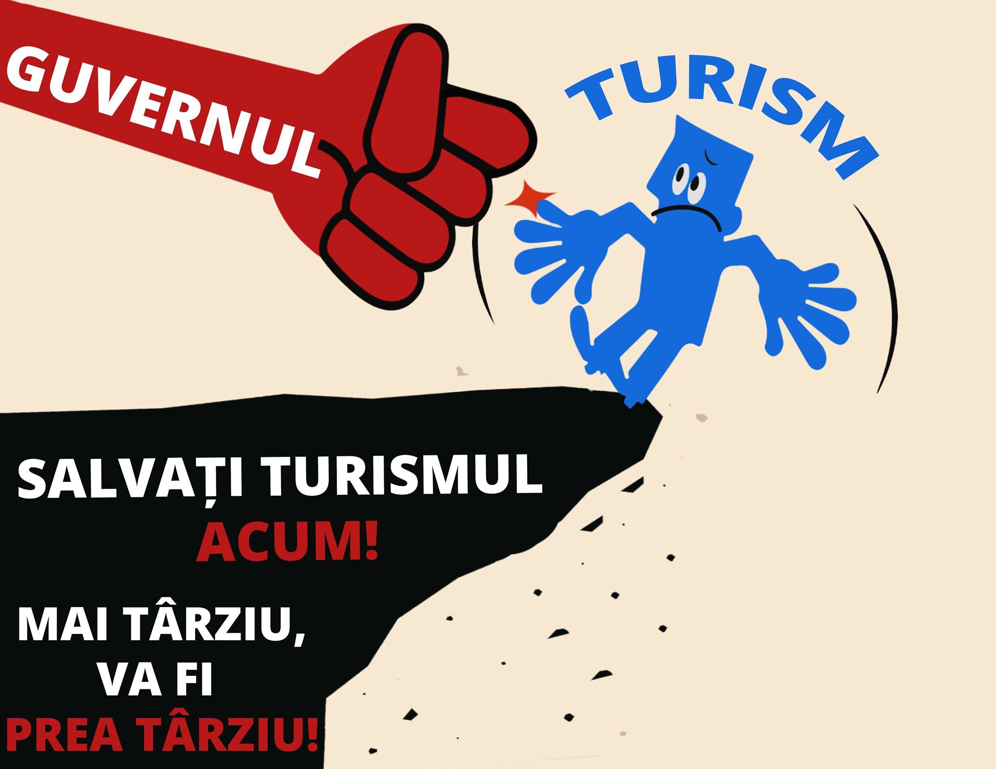 Pentru că ne aflăm în imposibilitatea de a ieși fizic în stradă, vrem să atragem atenția guvernului României că este timpul să ia o decizie pentru lucrătorii în turism, ACUM, nu mai târziu. Mai târziu s-ar putea să nu mai aibă pe cine ajuta. E momentul ca Guvernul României să ia atitudine și să arate responsabilitate pentru industria turismului”, este semnalul de alarmă tras de organizatorii #SalvatiTurismul.