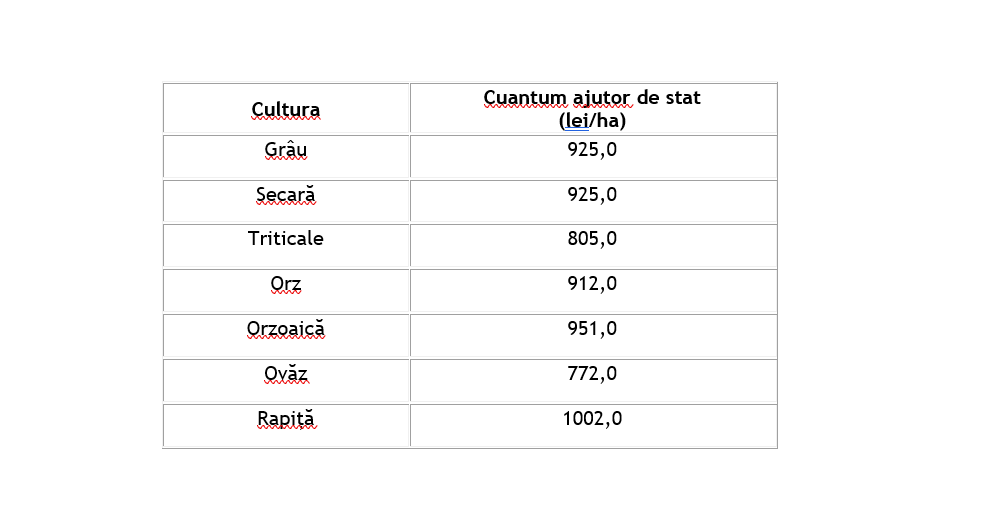 Ajutorul de stat se acordă beneficiarilor care au înființat în toamna anului 2019 următoarele culturi: – grâu, secară, triticale, orz, orzoaică, ovăz, rapiță.