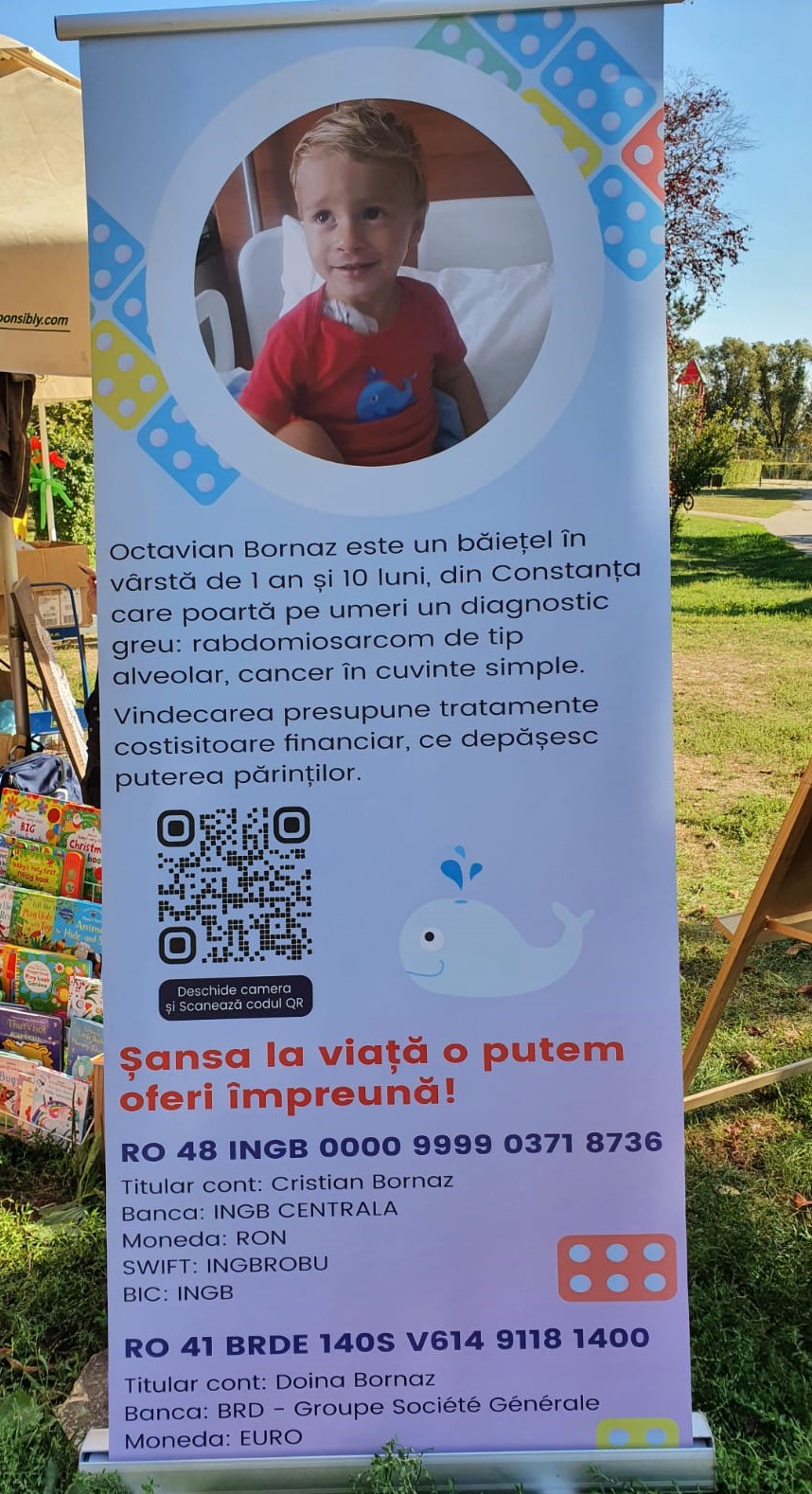 „Octavian Bornaz este un băiețel din Constanța, în vârstă de 1 an și 10 luni, diagnosticat cu rabdomiosarcom de tip alveolar, este un tip de cancer. Inițial a fost dus la București unde diagnosticul a fost greșit prima dată, apoi s-a pus diagnosticul corect. A urmat o intervenție chirurgicală, în urma căreia s-a spus că tumora a fost eradicată în proporție de 90%, ceea ce ulterior s-a confirmat a fi eronat. După această intervenție chirugicală, părinții au ales să meargă în afara țării pentru un control care a avut loc în Turcia, momentan fiind acolo internat. Diagnosticul a fost confirmat din păcate. O altă veste proastă pentru părinți: tumora nu a fost eradicată 90%, ci în jur de 50%. Cancerul este destul de agresiv, necesită chimioterapie. Momentan a trecut prin trei ședințe. La finalizarea întregului set de nouă ședințe se pare că va urma o nouă intervenție chirurgicală, apoi medicii vor decide parcursul tratamentului. Inițial va avea nevoie de 60.000 euro, sumă pentru care noi ne-am strâns aici, unde sperăm să strângem o mică parte, cealaltă parte fiind completată de donațiile din partea tuturor oamenilor care vor să fie alături de el și de familia lui.”, spune Mădălina Belu, unul dintre organizatori.