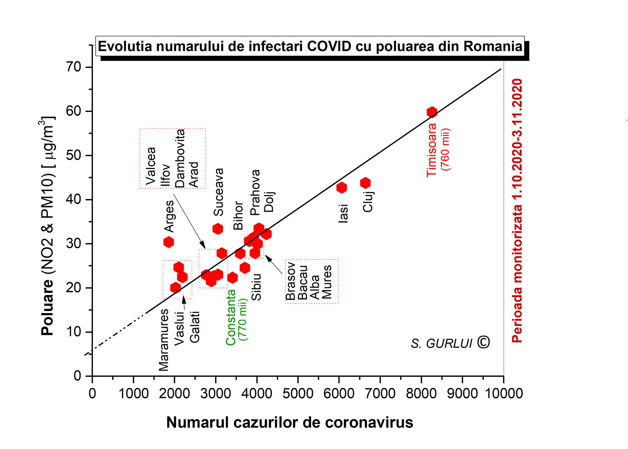 Silviu Gurlui: Este foarte adevărat, în ultima perioadă s-a înregistrat un număr foarte mare de COVID. Eu am făcut un studiu (măcar preliminar) din perspectiva unor poluanți la nivelul țării. Este vorba despre particulele PM 10 (adică particule cu dimensiuni de sub 10 micrometri) respectiv de oxizi de azot. Acești doi compuși, acești doi poluanți par a juca un rol fundamental în răspândirea și în agresivitatea virusului. S-au înregistrat în această perioadă concentrații mai mari ai unor poluanți în Timișoara (unde avem cel mai mare număr de infectări în această perioadă). La polul opus în plaja județelor analizate de mine, cu un număr de peste 2000 de cazuri înregistrate de la 1 octombrie până la 3 noiembrie se află Mureș. Concentrația poluanților este aici redusă. De asemenea, se vede foarte clar: Constanța și Timișoara au o populație comparabilă, dar pentru că Timișoara poluarea este de până la 2,5 ori mai mare față de Constanța, în acest raport se găsește și numărul total de îmbolnăviri. Constanța chiar dacă are populație mai numeroasă, stă ceva mai bine decât restul județelor din țară. Acest lucru arată că populația este mai mică și joacă un rol fundamental. Nivelul de poluare este extrem de important în această perioadă , toamna crește poluarea foarte mult din varii motive, printre acestea suprapunându-se diverse fenomene meteorologice precum inversiunea termică. În opinia mea este extrem de important pentru a reduce severitatea și numărul îmbolnăvirilor, trebuie redusă foarte mult poluarea în zonele unde deja se știe că este la un nivel foarte ridicat. O reducere fundamentală va scădea foarte mult acest număr al îmbolnăvirilor.