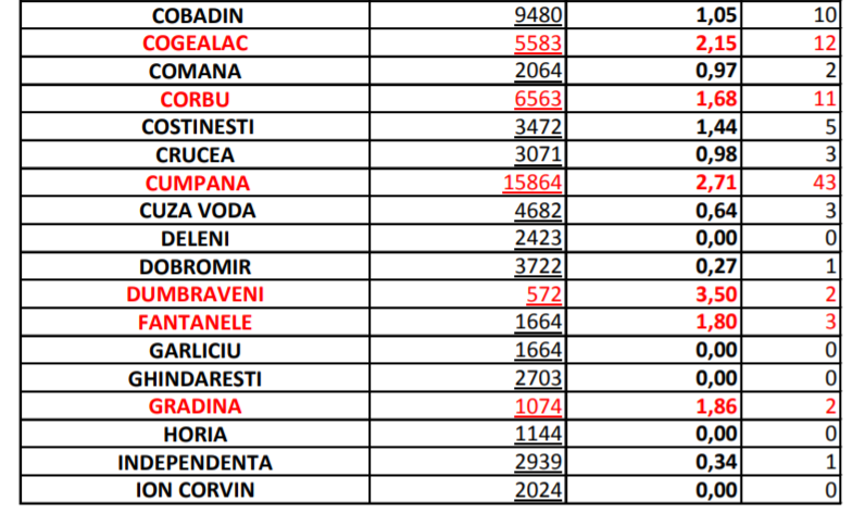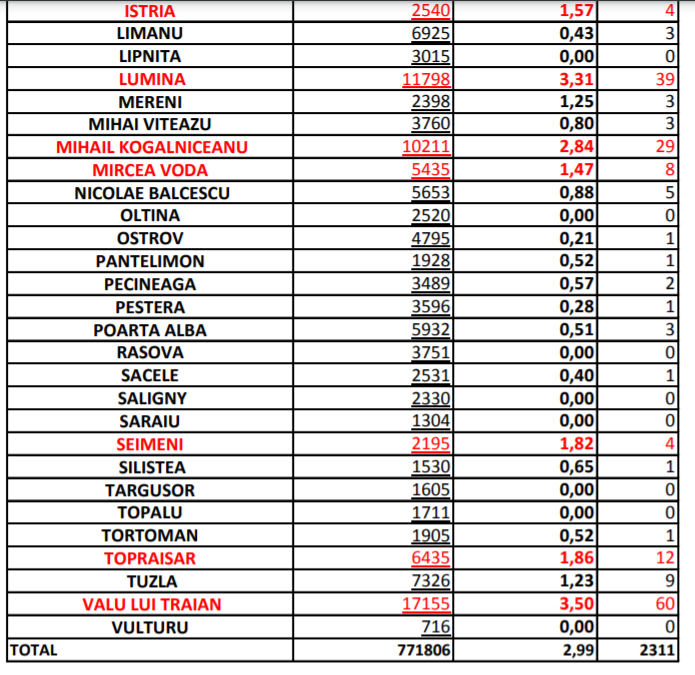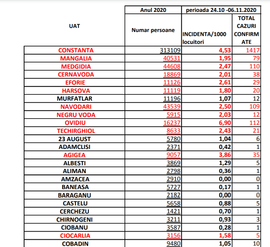 Rata infectărilor cu coronavirus în municipiul Constanța este de 4,53/1000, iar pe județ, 2,99. Situația în celelate localități