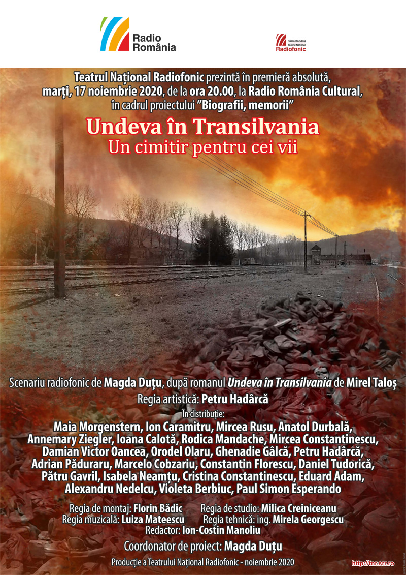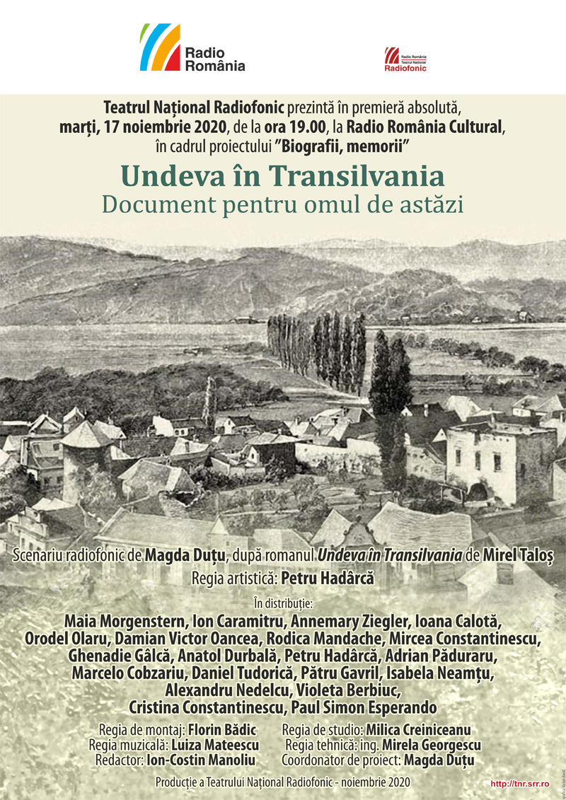 Teatrul Naţional Radiofonic prezintă în premieră absolută, marţi, 17 noiembrie 2020, între orele 19:00 – 21:00, la Radio România Cultural, în seria Biografii, memorii, două spectacole-document realizate după romanul lui Mirel Taloș – Undeva în Transilvania.