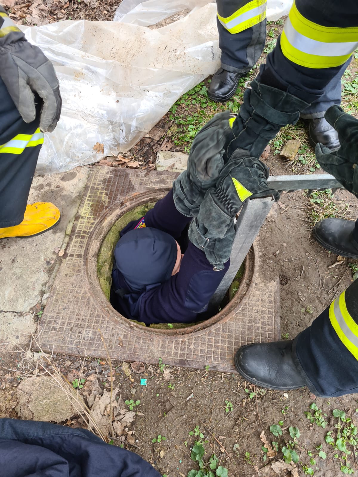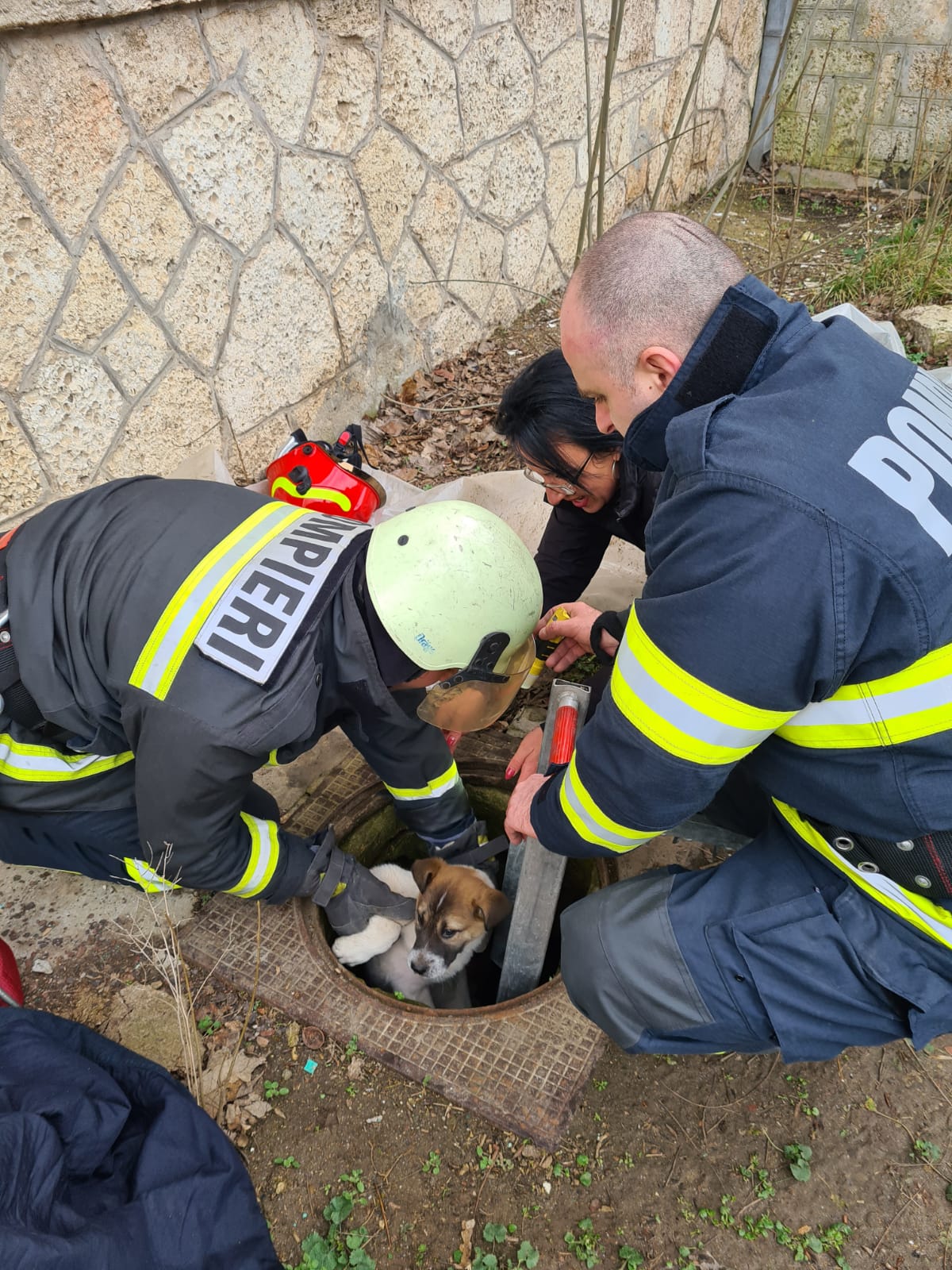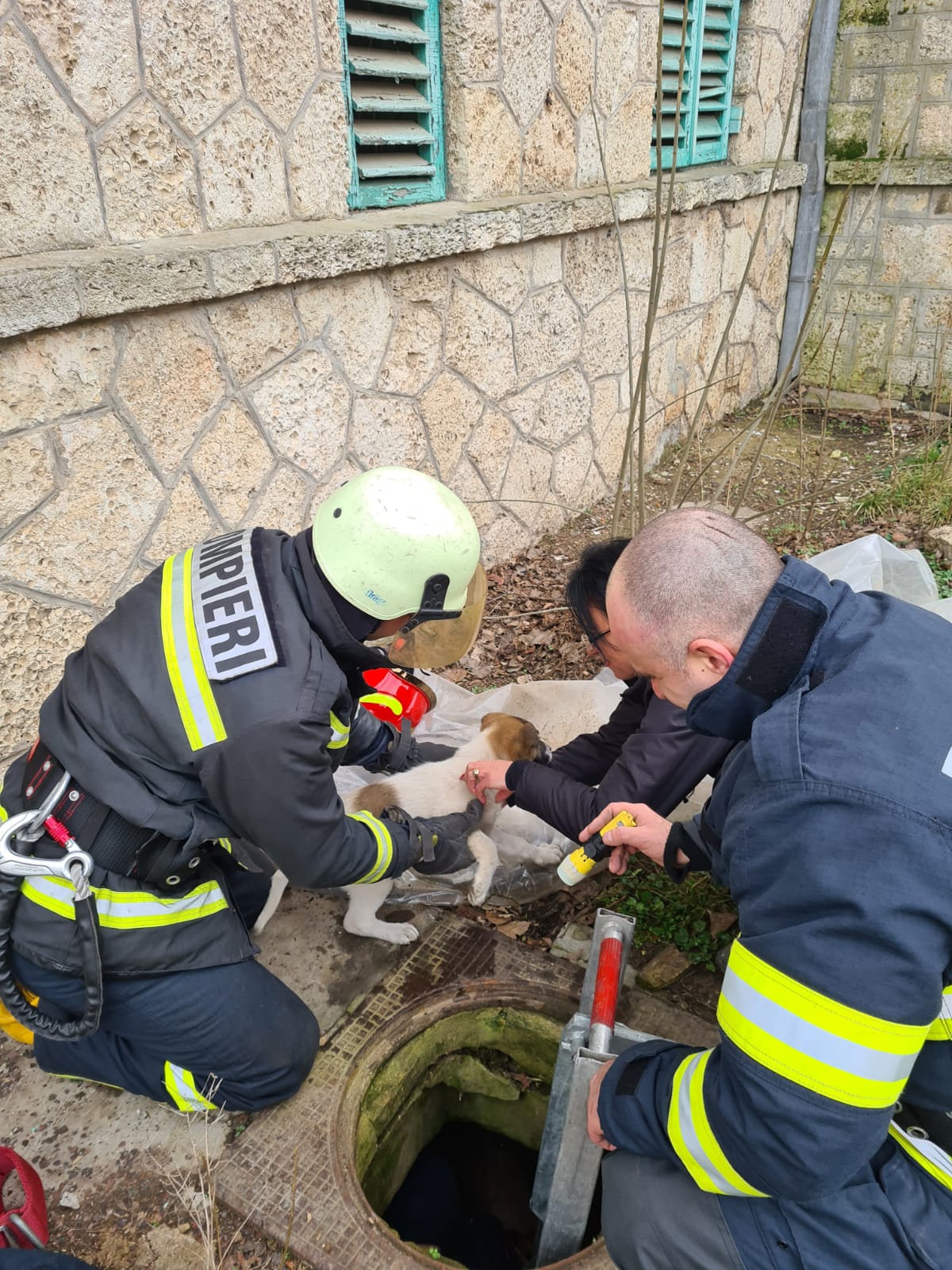Doi căţei, căzuţi în canalizare, au fost salvaţi de pompieri – FOTO