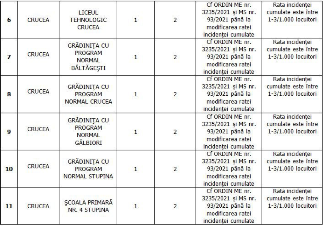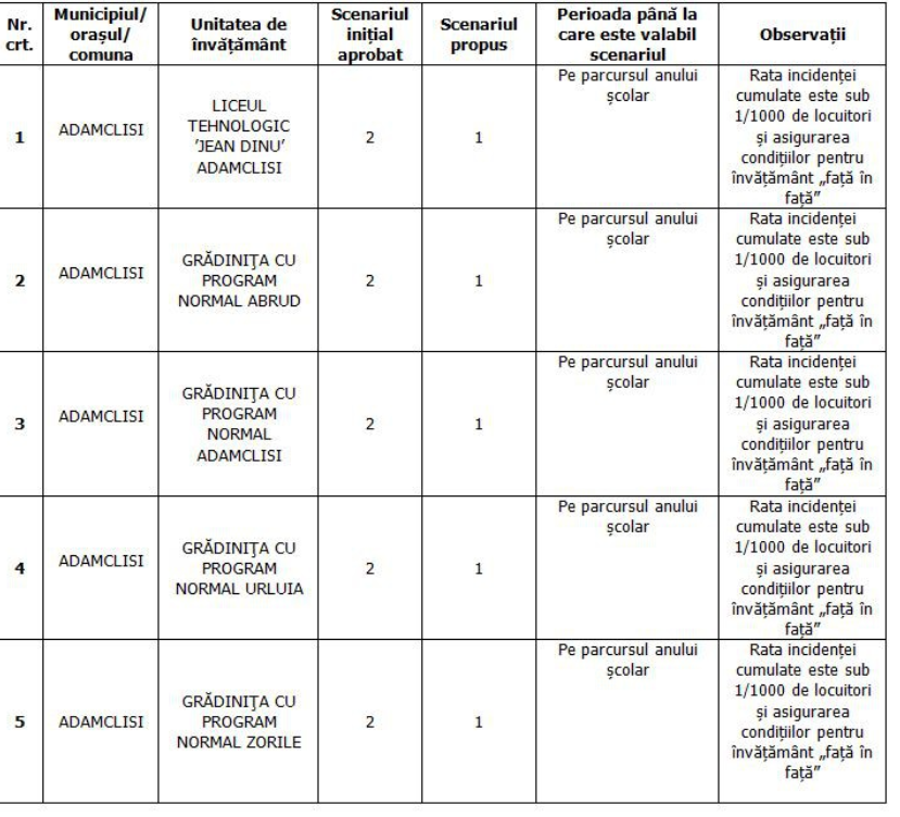 Având în vedere prevederile Ordinului Ministerului Educației nr. 3235/04.02.2021 și Cercetării și Ministerului Sănătății nr. 93/04.02.2021 pentru aprobarea măsurilor de organizare a activității în cadrul unităților/instituțiilor de învățământ în condiții de siguranță epidemiologică pentru prevenirea îmbolnăvirilor cu virusul SARS-CoV-2, se propune aplicarea modificării scenariilor de organizare și desfășurare a cursurilor, an școlar 2020-2021, conform tabelului următor: