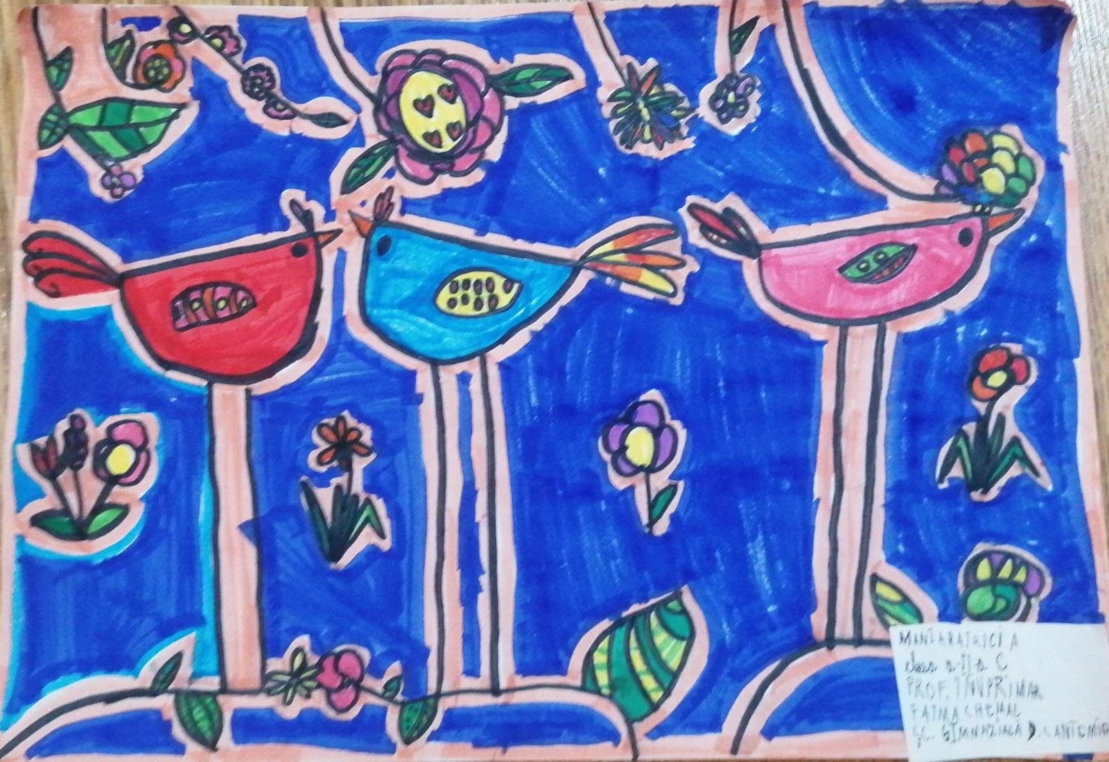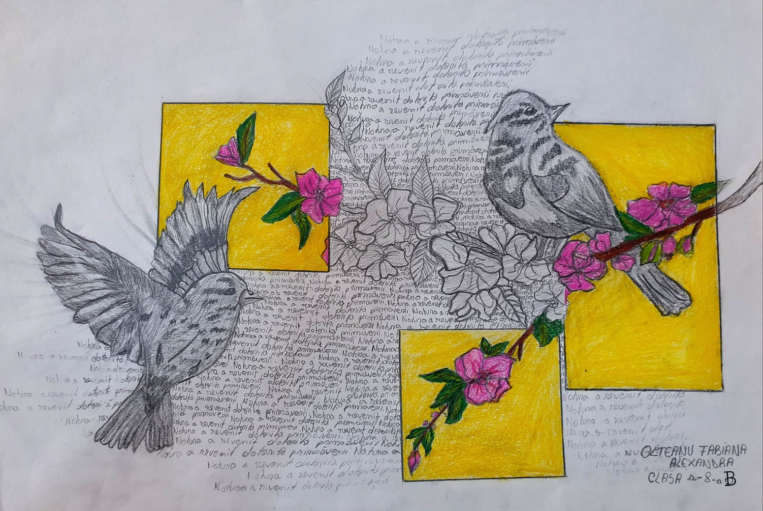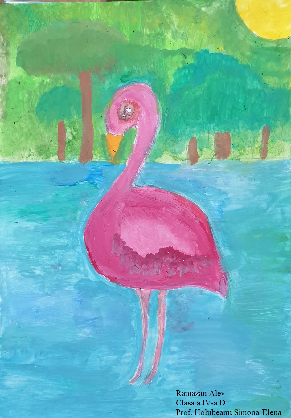 „Am ales să pictez păsări viu colorate, iar pictura mea exprimă bucurie și sensibilitate. Deși penele lor strălucesc, culoarea lor nu le împiedică să se camufleze prin verdeața plantelor. Întreaga natură primește primăvara cu brațele deschise!”, a spus Maria, elevă tot în clasa a V-a.
