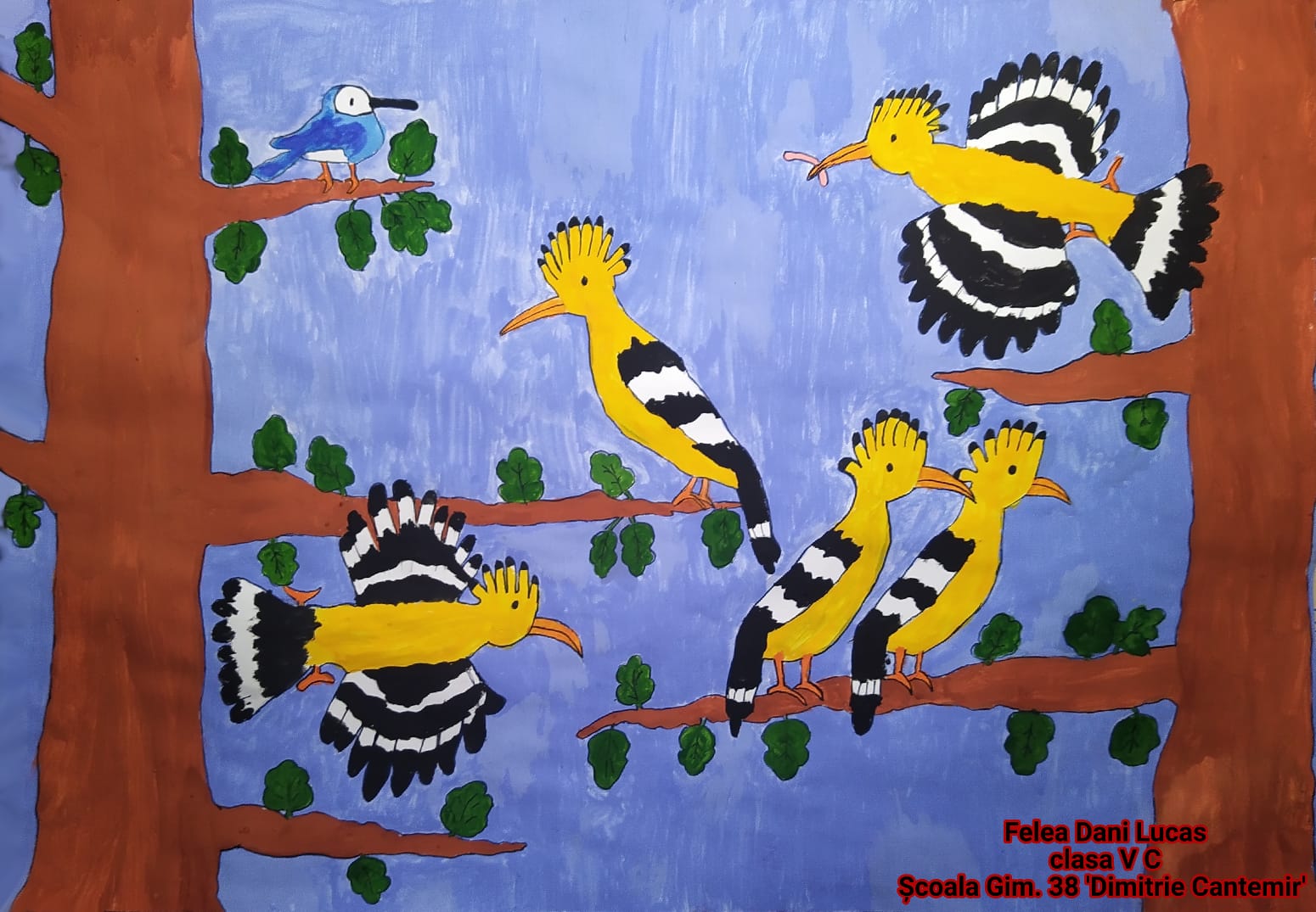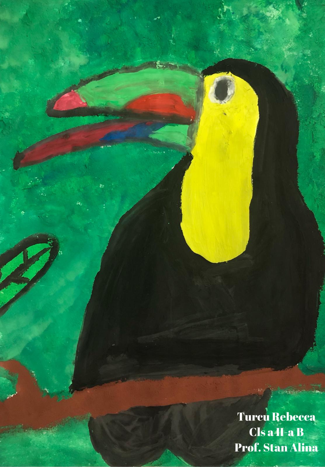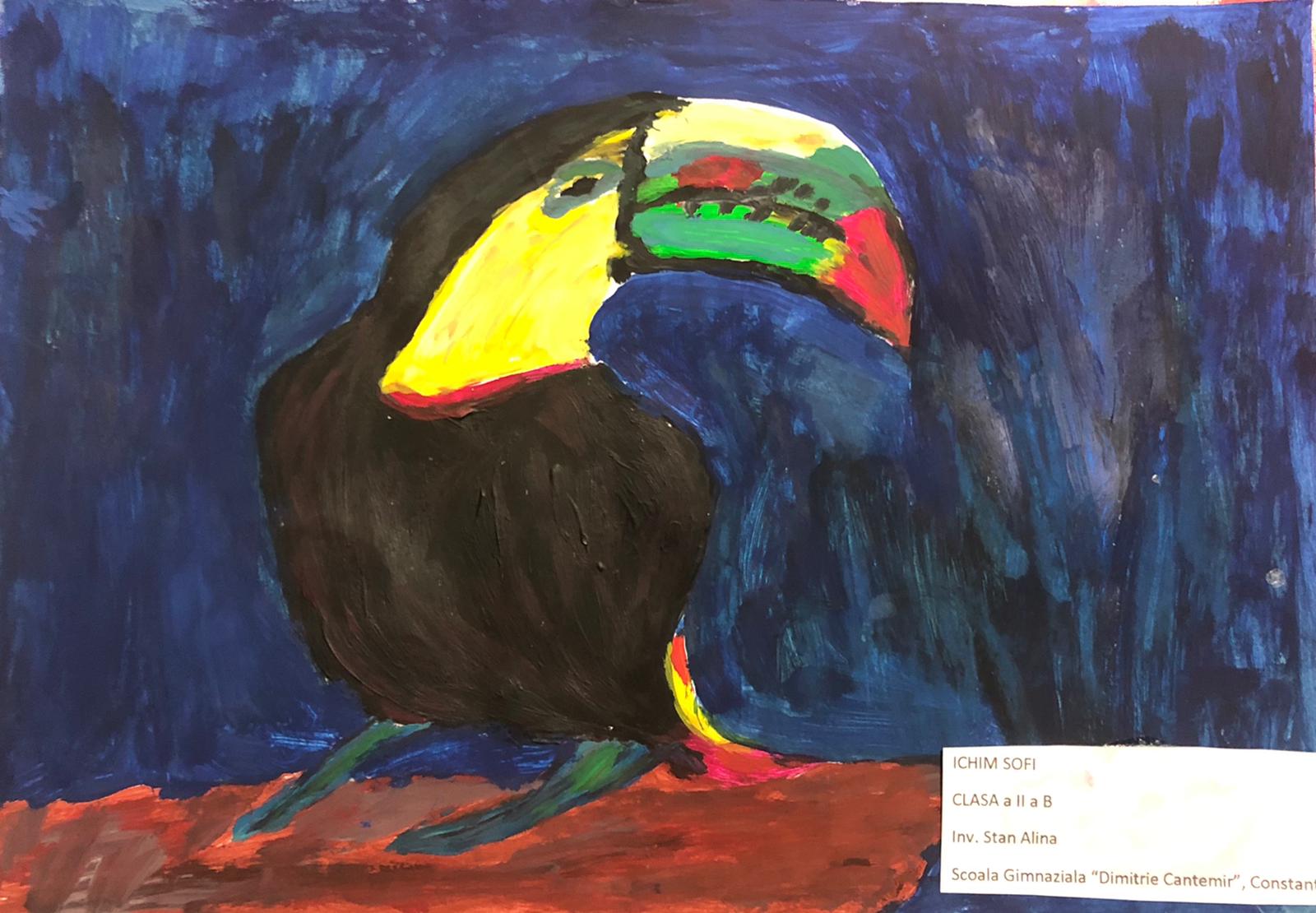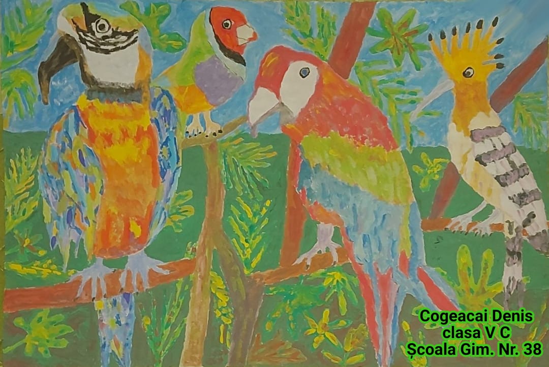 „Această temă cu păsările a trebuit să fie foarte colorată și din prima mi-a venit ideea de păsări tropicale, mai ales tucanul. Tucanul este pasărea mea preferată și am dorit de la început să-l desenez. Am mai adăugat doi papagali pentru paleta lor de culori minunată, dar nu am putut rezista să nu fac și o temă cu păsări românești. Atunci, mi-a venit ideea de pupăză, după mica întâmplare din „Amintiri din copilărie” de Ion Creangă și am desenat-o în mai multe poziții.”, spune Lucas, elev în clasa a V-a.
