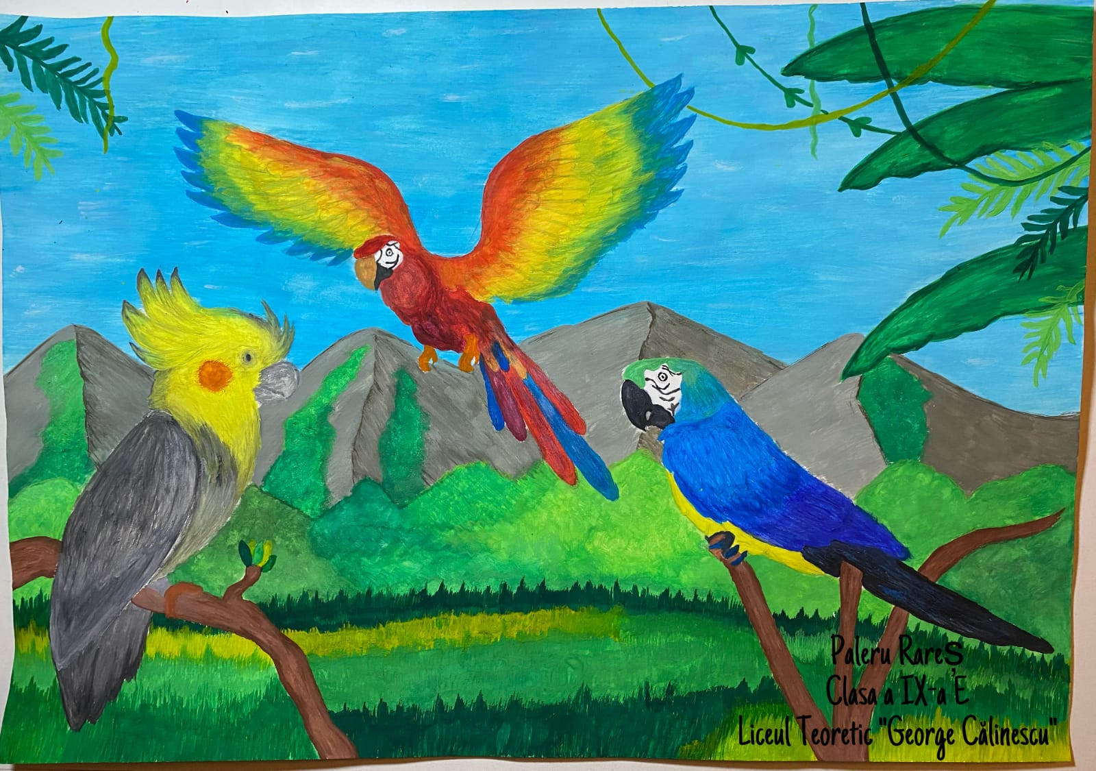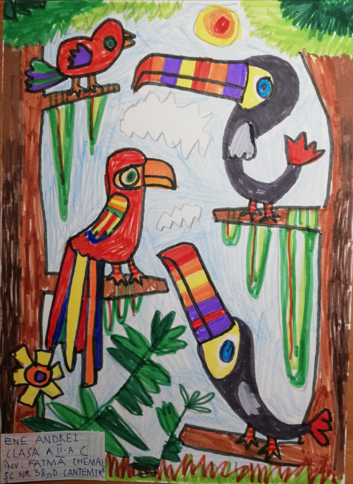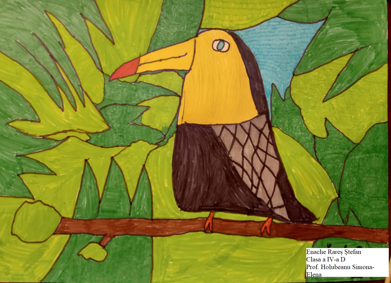 „Această temă cu păsările a trebuit să fie foarte colorată și din prima mi-a venit ideea de păsări tropicale, mai ales tucanul. Tucanul este pasărea mea preferată și am dorit de la început să-l desenez. Am mai adăugat doi papagali pentru paleta lor de culori minunată, dar nu am putut rezista să nu fac și o temă cu păsări românești. Atunci, mi-a venit ideea de pupăză, după mica întâmplare din „Amintiri din copilărie” de Ion Creangă și am desenat-o în mai multe poziții.”, spune Lucas, elev în clasa a V-a.