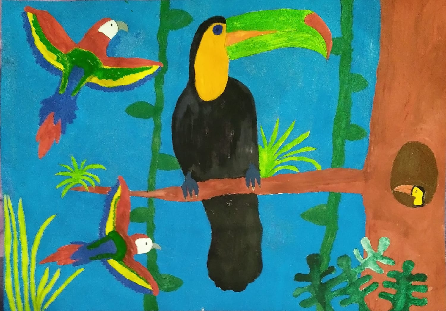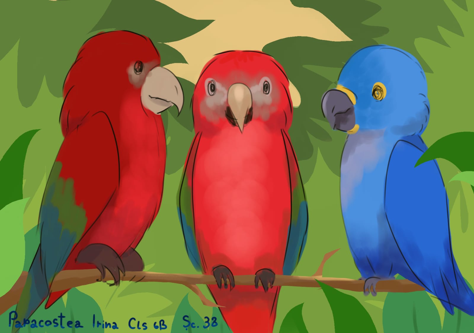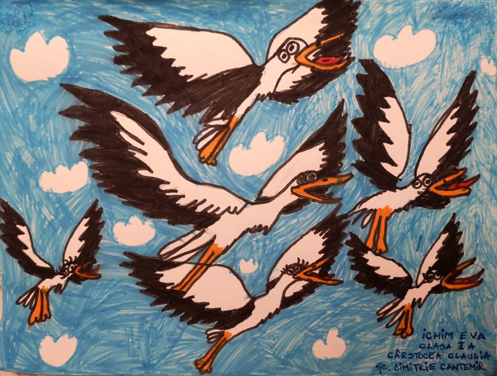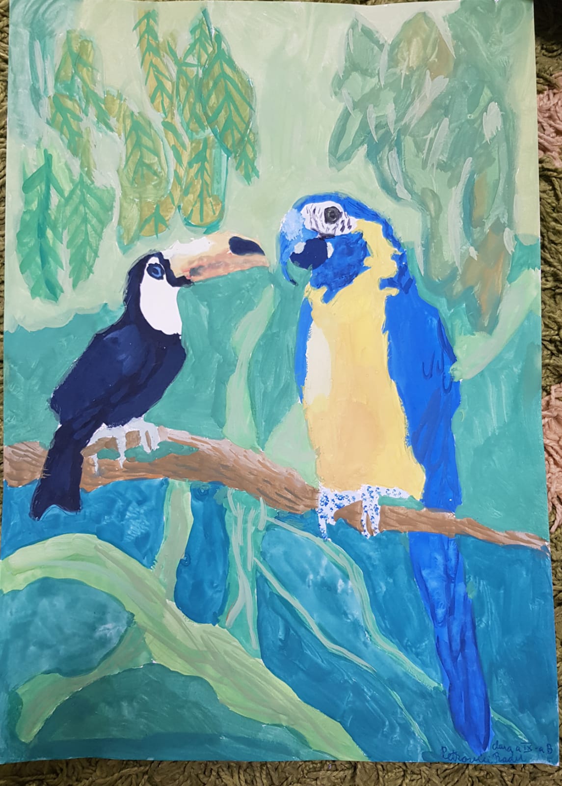 „Această temă cu păsările a trebuit să fie foarte colorată și din prima mi-a venit ideea de păsări tropicale, mai ales tucanul. Tucanul este pasărea mea preferată și am dorit de la început să-l desenez. Am mai adăugat doi papagali pentru paleta lor de culori minunată, dar nu am putut rezista să nu fac și o temă cu păsări românești. Atunci, mi-a venit ideea de pupăză, după mica întâmplare din „Amintiri din copilărie” de Ion Creangă și am desenat-o în mai multe poziții.”, spune Lucas, elev în clasa a V-a.