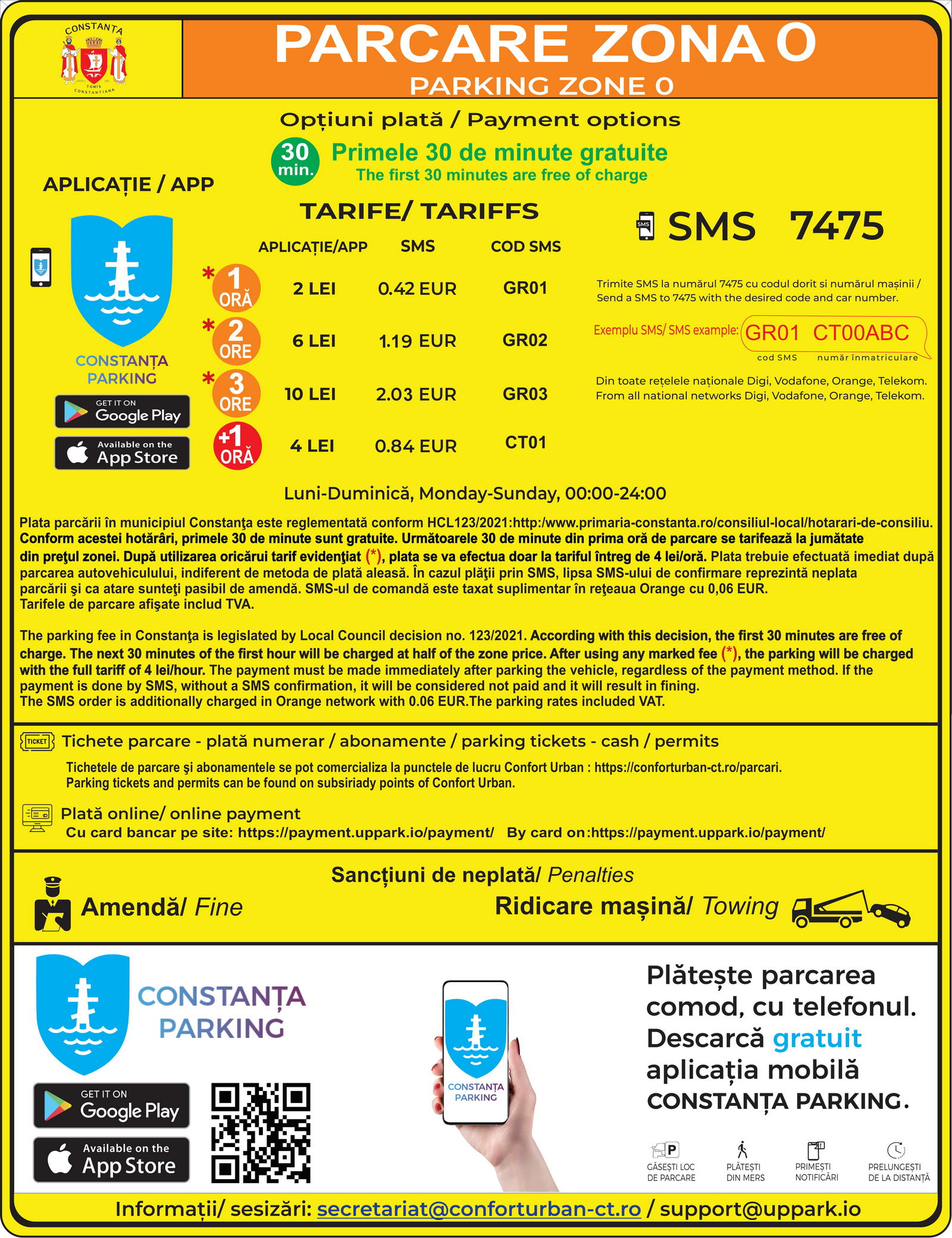 Detalii referitoare la modalitățile de plată a parcării sunt disponibile pe site-ul SC Confort Urban SRL, accesând următorul link: https://conforturban-ct.ro/DOCUMENTE/PARCARI/Modalitati%20de%20plata%20parcari.pdf