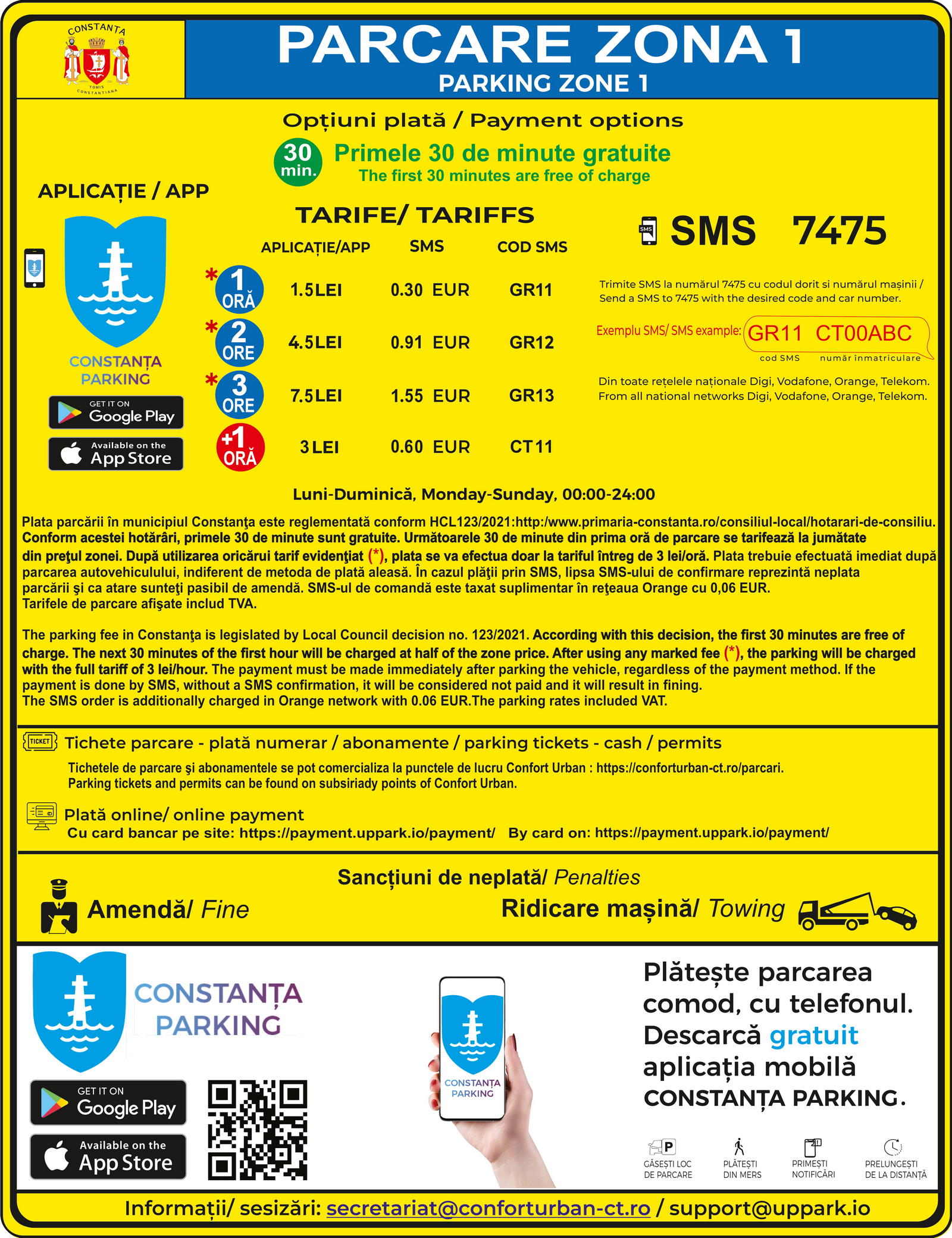 Plata parcării în municipiul Constanța este reglementată conform HCL nr. 123/2021. Conform acestei hotărâri, primele 30 de minute sunt gratuite. Următoarele 30 de minute din prima oră de parcare se tarifează la jumătate din prețul zonei. După utilizarea oricărui tarif evidențiat, plata se va efectua doar la tariful întreg.