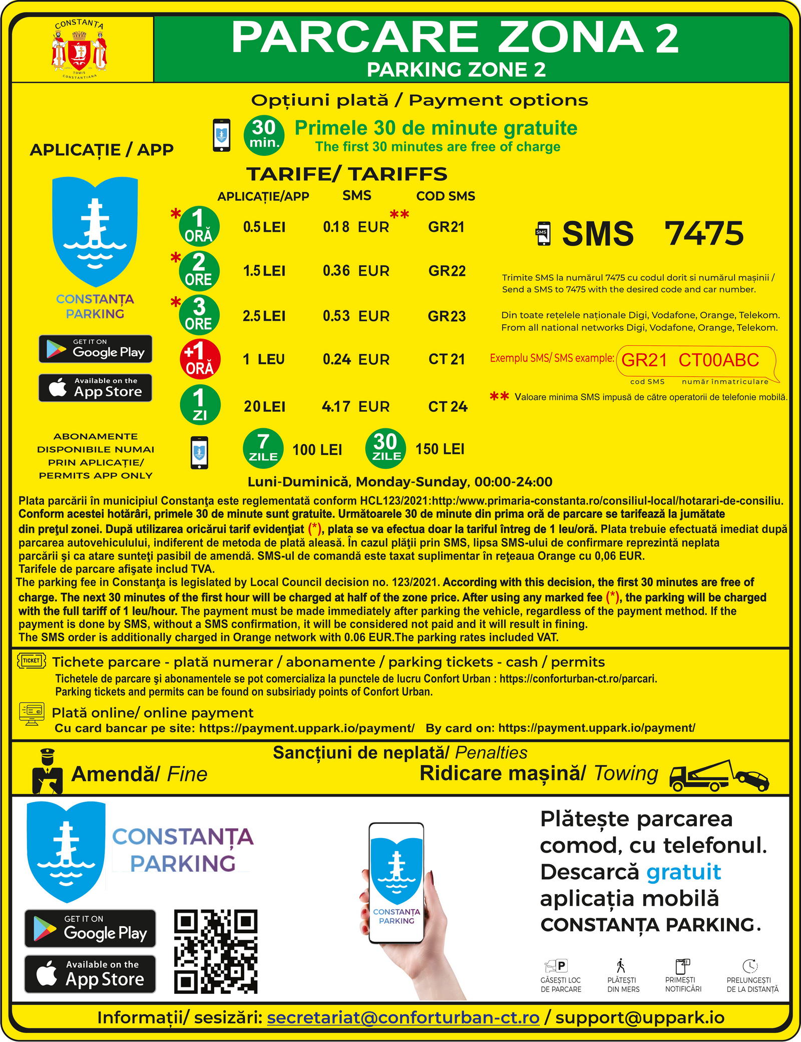 Instituțiile publice și de interes public, precum și persoanele juridice și persoanele fizice autorizate care își desfășoară activitatea comercială sau profesională în zonele 0, 1 și 2, pot solicita eliberarea unui abonament de parcare. Solicitările se trimit pe adresa de e-mail: secretariat@conforturban-ct.ro