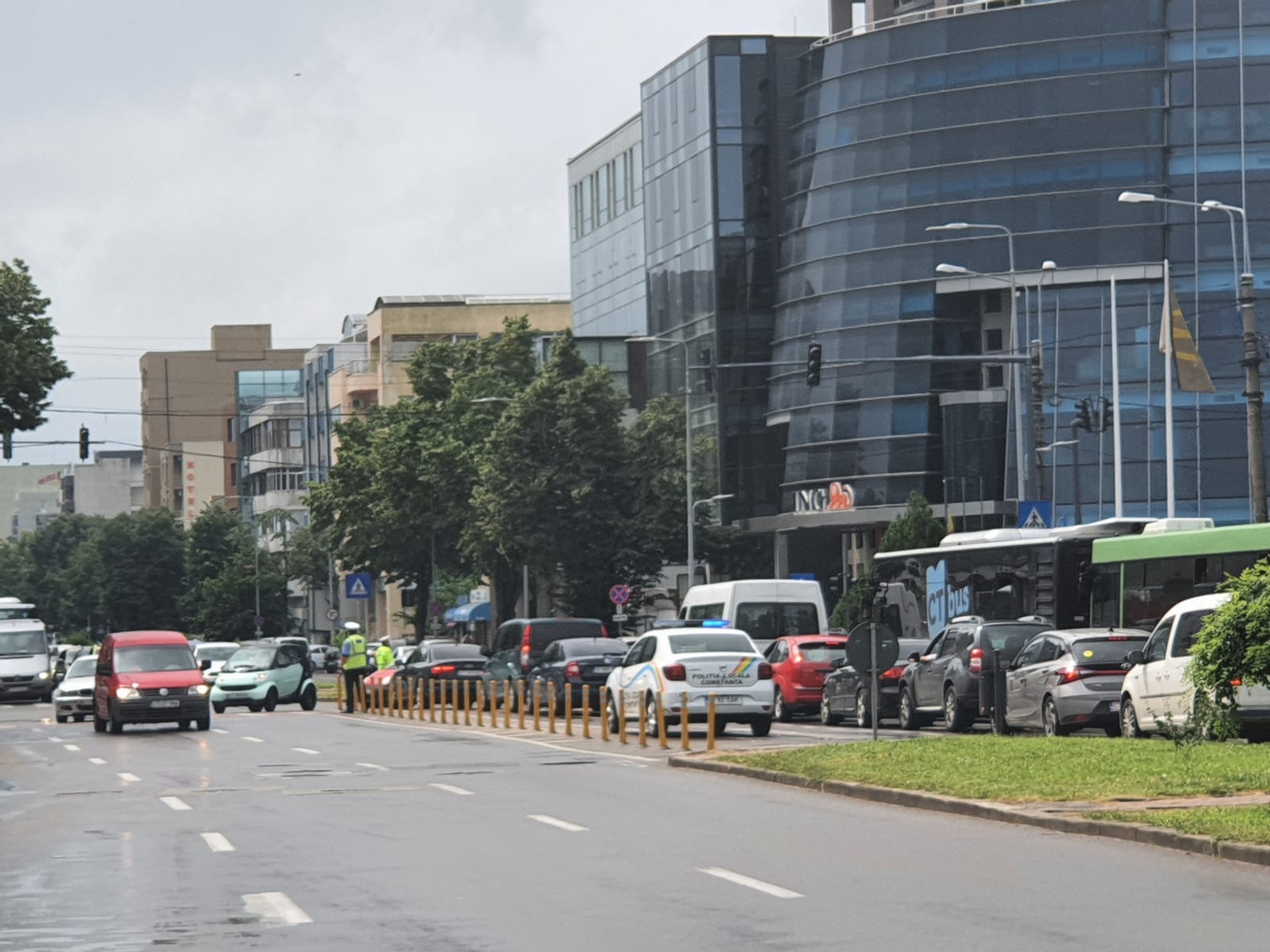 Un echipaj al Direcției Generale Poliția Locală se află în zonă, pentru a dirija traficul rutier.