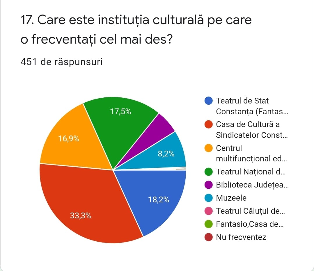 Alte rezultate cu caracter general sunt că: 42% dintre participanții la sondaj consideră că locul ocupat de cultură în agenda de preocupări și activități este constant, 48% ocazional, iar restul nesemnificativ.