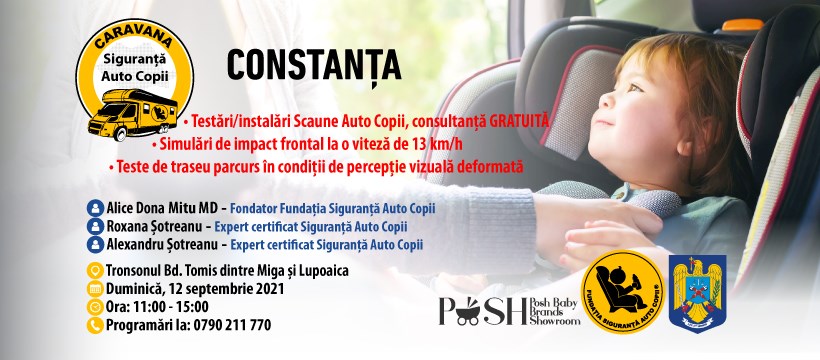 Roxana Șotreanu: Într-adevăr, am ales să facem noi acest lucru și să mergem noi la părinții din toată țara pentru că nu avem decât două centre. Mi-ar plăcea să reușim să deschidem centre în fiecare județ. Însă, până ce acest lucru va fi posibil, am ales să inițiem acest proiect unic în România al Caravanei Siguranța Auto Copii cu care ne-am deplasat până acum în multe dintre județele țării noastre și nu vom înceta să facem acest lucru până aproape de venirea iernii. Inclusiv în octombrie și noiembrie vom face deplasări în țară.  Copiii nu știu cum să se protejeze singuri, așa că îi rog pe părinți să facă alegeri asumate și documentate, să aleagă scaune auto testate la impact care să fie atestate vârstei, înălțimii și greutății copiilor, să nu cadă în capcana plânsetului. Copiii nu plâng neapărat pentru că sunt ținuți în scaunul auto. Poate s-au plictisit, poate au niște nevoi fiziologice nesatisfăcute. Însă, principiul pe care ar trebui să îl urmeze toată lumea este că siguranța auto a copilului nu este opțională. Și mai bine să avem un copil plâns decât unul rănit. Caravana Siguranța Auto Copii ajunge săptămâna aceasta, duminică, 12 septembrie, la Constanța. Îi invităm pe toți părinții să ne viziteze cortul caravanei. Se vor face testări și probe cu scaunele auto. Avem alături de noi și simulatorul la impact în care doritorii se pot așeza și pot vedea cum se resimte un impct la doar 13km/h. Noi îi vom invita pe toți cei care sunt părinți să țină în brațe un manechin de aproximativ 6 kilograme. Ca să vadă cât de dificil este acest lucru în cazul unui impact minor. Ne veți găsi duminică pe Bulevardul Tomis, între Miga și Lupoaică, în zona Primăriei. Acolo traficul pentru mașini va fi închis și cu siguranță vom fi foarte vizibili. Vă așteptăm la eveniment în număr cât mai mare! Părinților le lăsăm și adresa noastră din Constanța: Bulevardul Mamaia nr.213.Le stăm la dispoziție și cu site-ul: www.siguranta-auto-copii.ro și cu numărul de telefon: 0790.211.770.