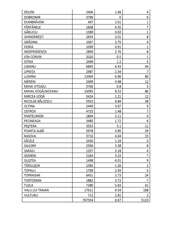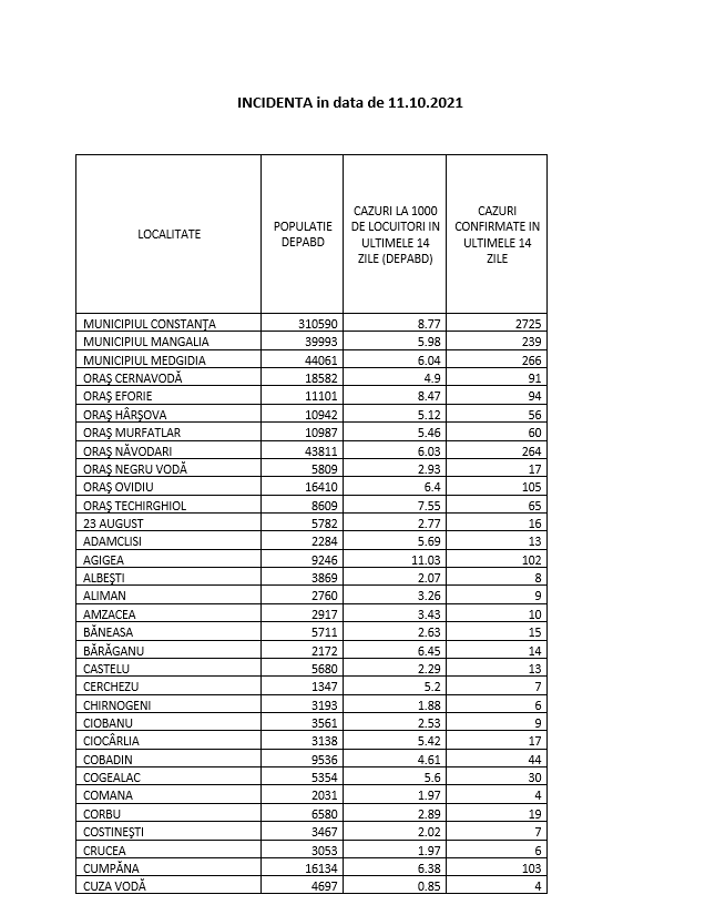 Iată care este rata incidenţei şi în celelalte localităţi din judeţul Constanţa: