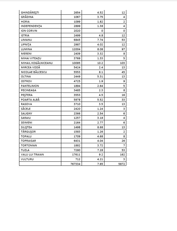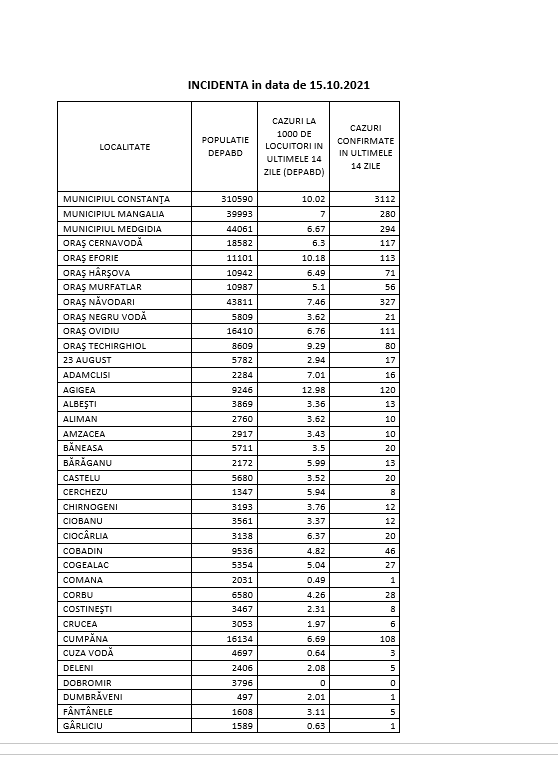 În judeţul Constanţa au fost înregistrate 848 de cazuri noi, incidenţa fiind de 7,65. În judeţul Tulcea, au fost confirmate 228 de infectări incidenţa fiind de 5,17 cazuri la mia de locuitori.