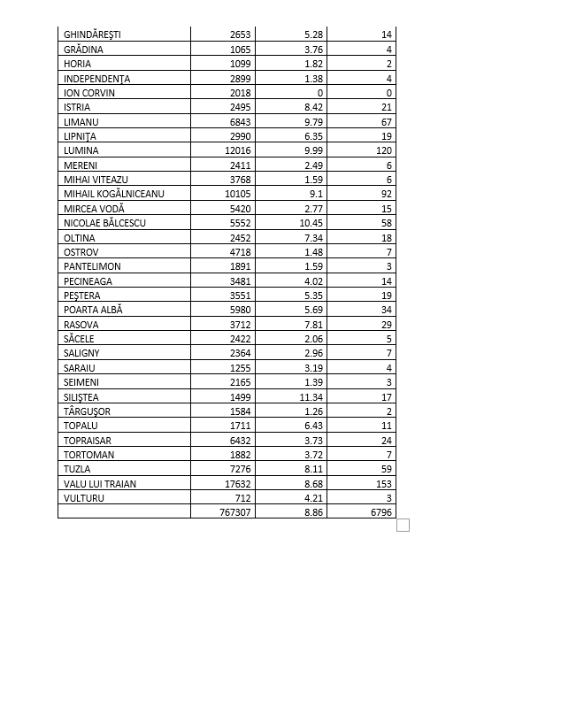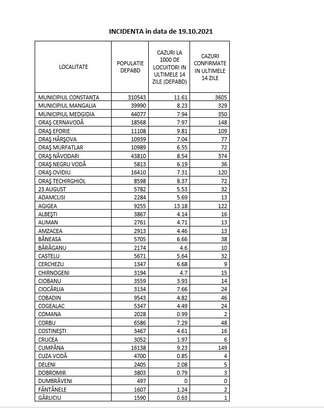 În judeţul Constanţa au fost înregistrate 655 de cazuri noi, rata de infectare fiind de 8,86, la nivelul judeţului, şi 11,62 – la nivelul municipiului. În Tulcea, au fost confirmate 107 cazuri noi (5,97 – rata de infectare, la nivelul judeţului).