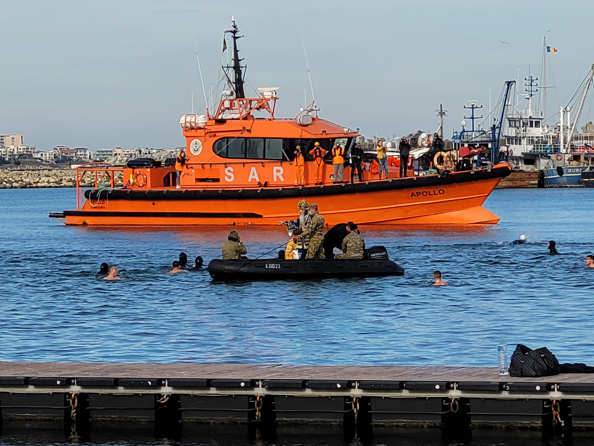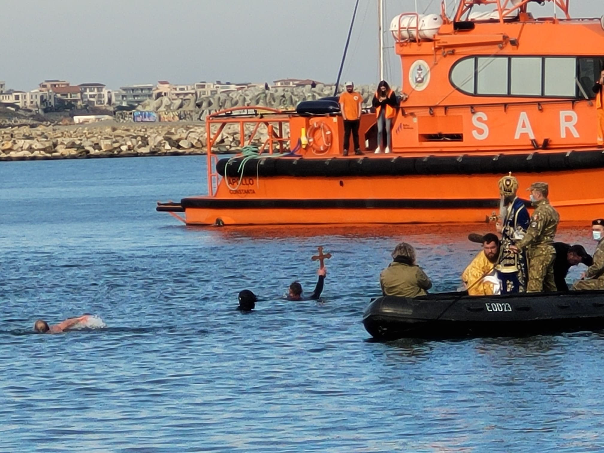 Arhiepiscopul Tomisului s-a urcat apoi în barcă și a aruncat cele trei cruci, care au fost recuperate de trei bărbați. 150 de mii de PET-uri cu apă sfinţită au fost pregătite pentru sărbătoarea de astăzi.
