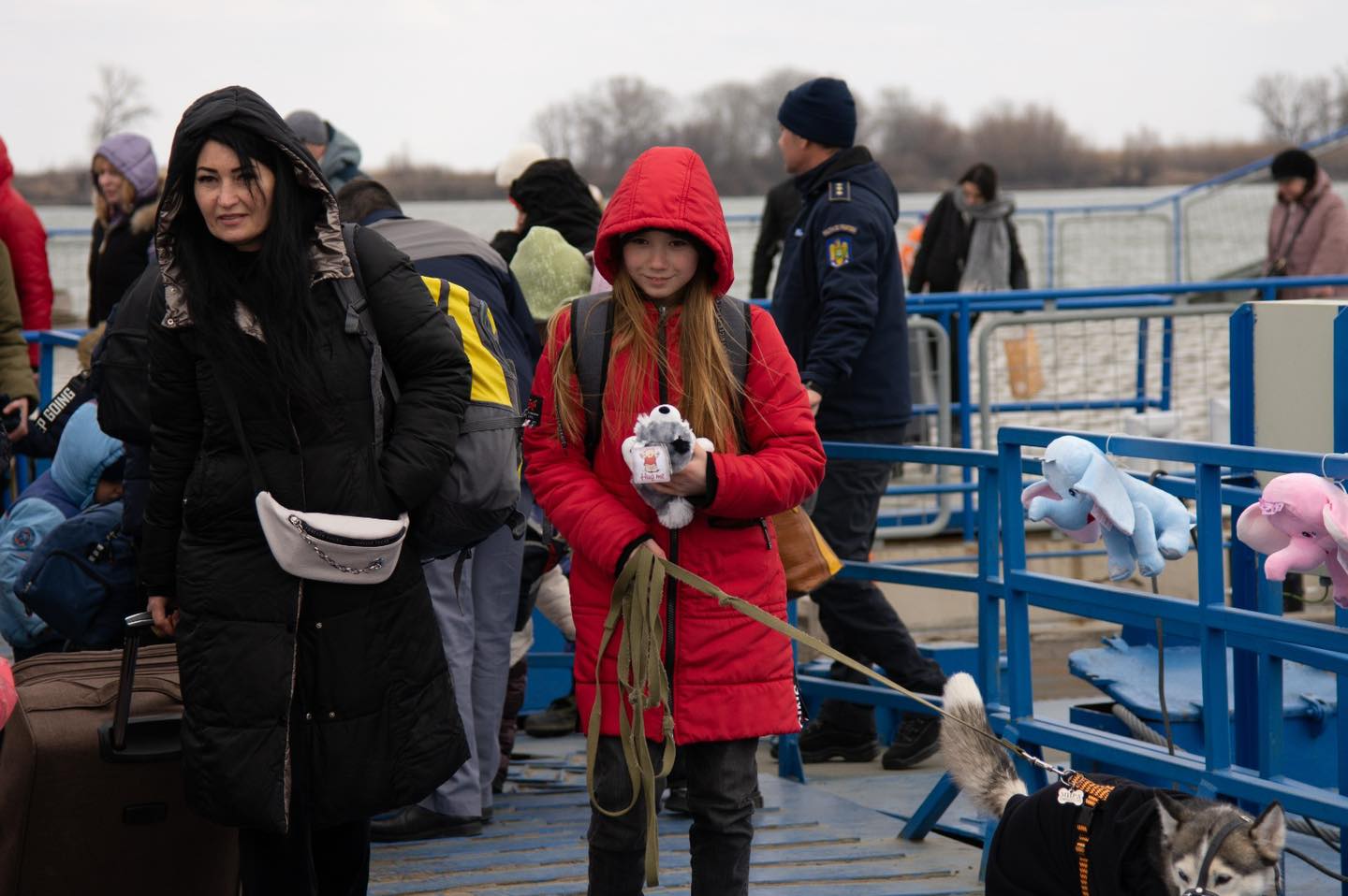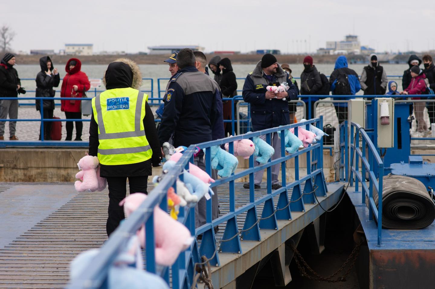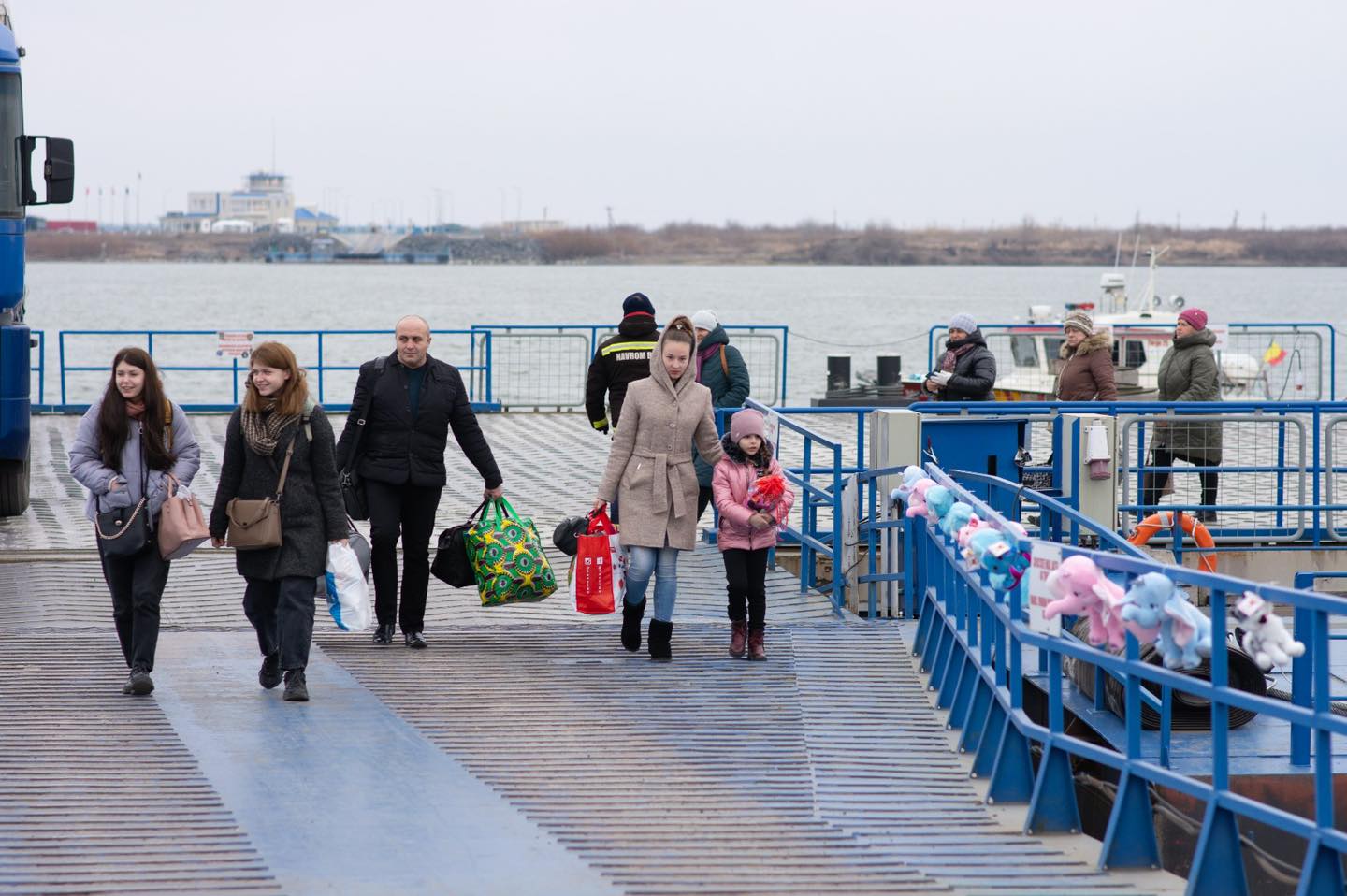 La coborârea de pe bac, la Isaccea, în județul Tulcea, ursuleți, elefanți, girafe şi purceluși de pluș le zâmbesc copiilor familiilor de refugiați ucraineni.