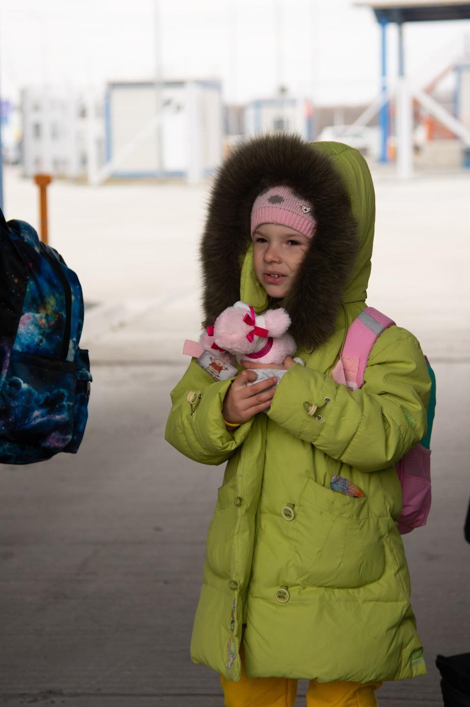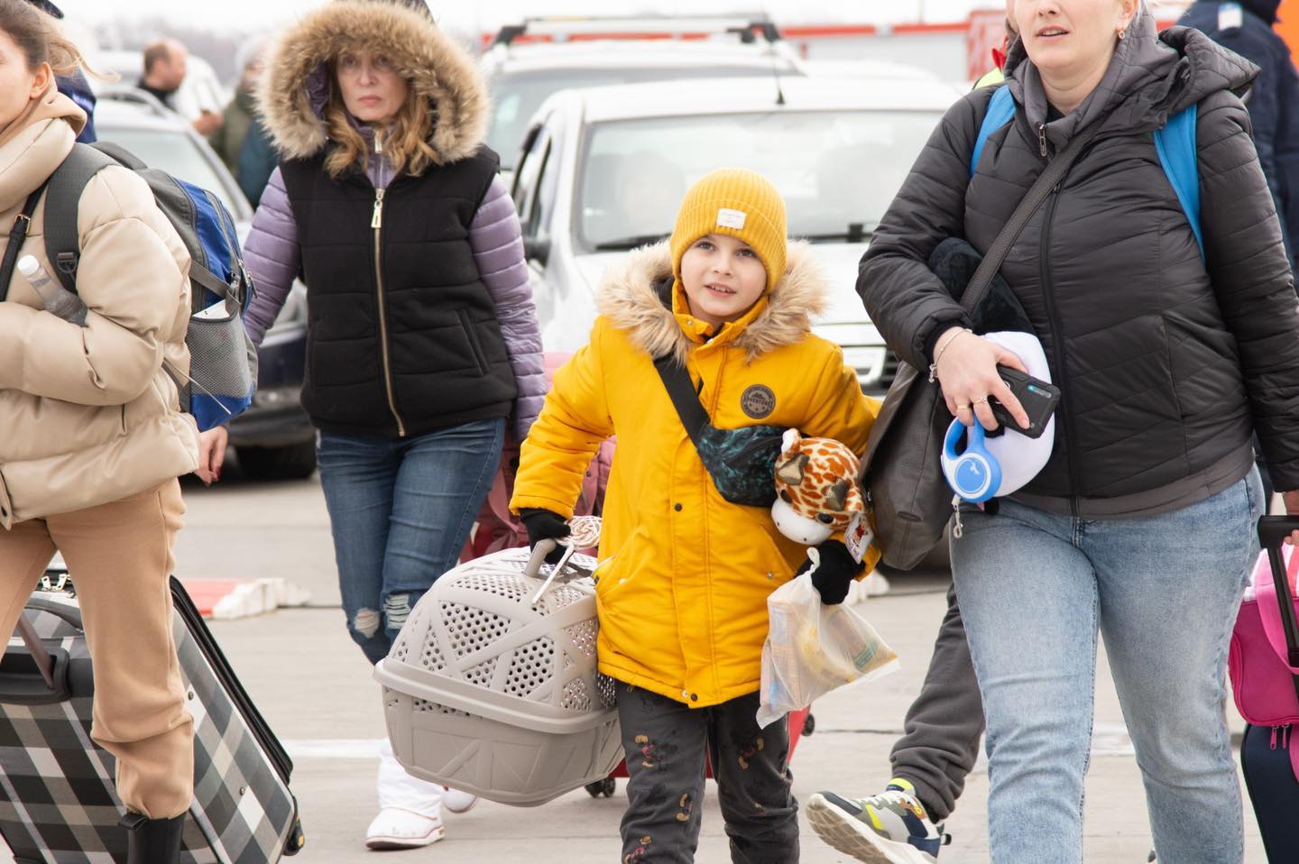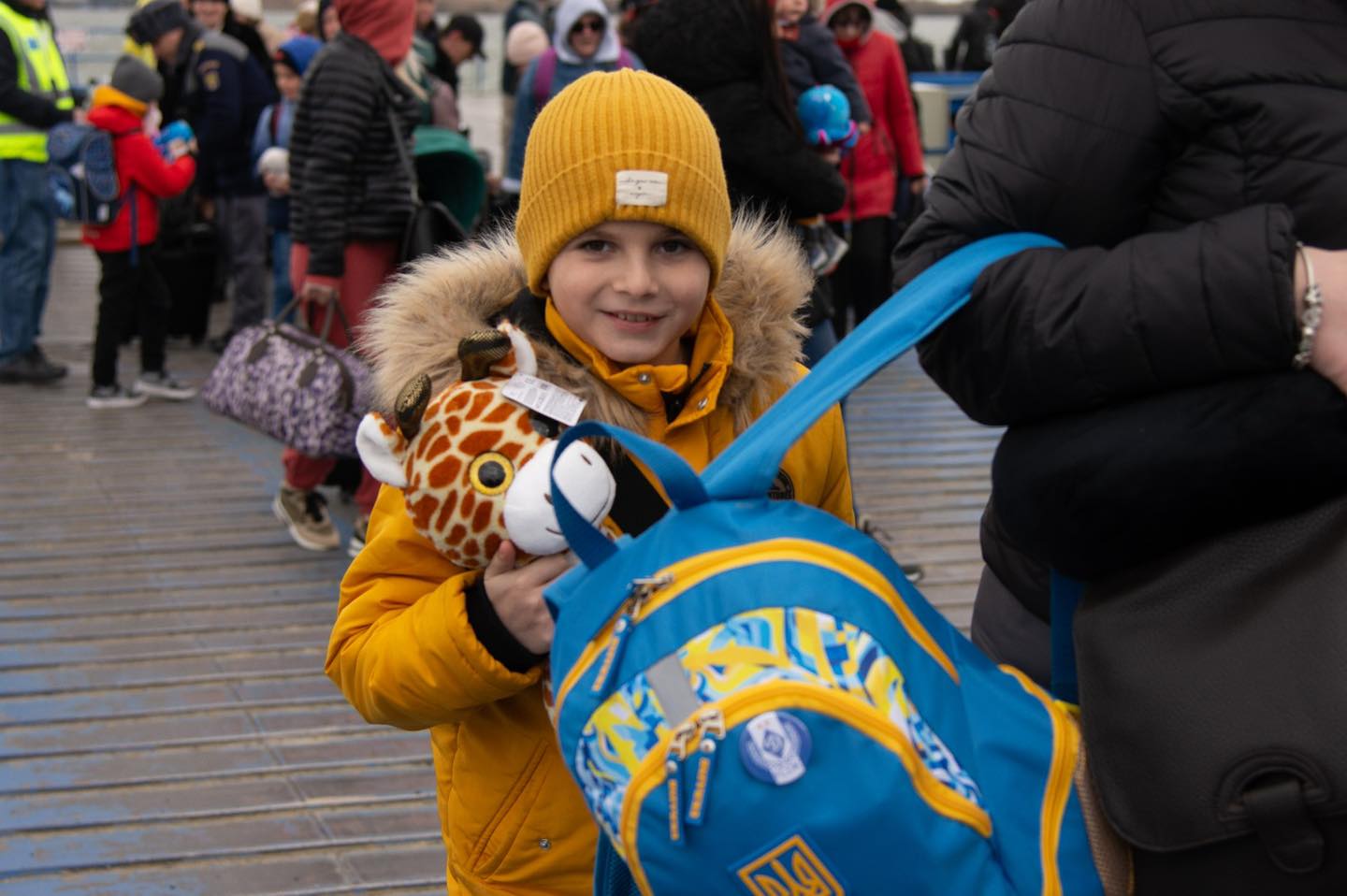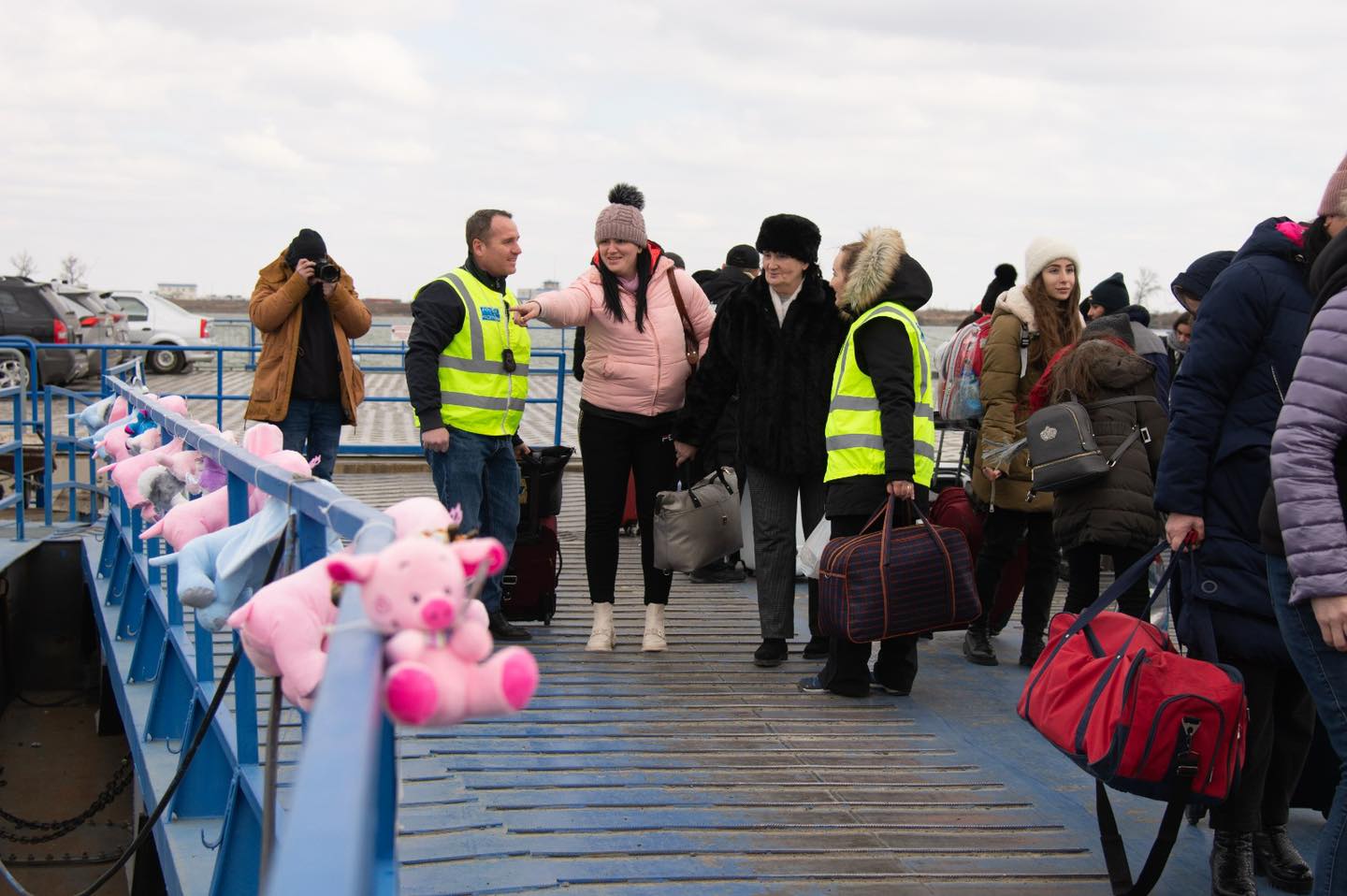 La coborârea de pe bac, la Isaccea, în județul Tulcea, ursuleți, elefanți, girafe şi purceluși de pluș le zâmbesc copiilor familiilor de refugiați ucraineni.